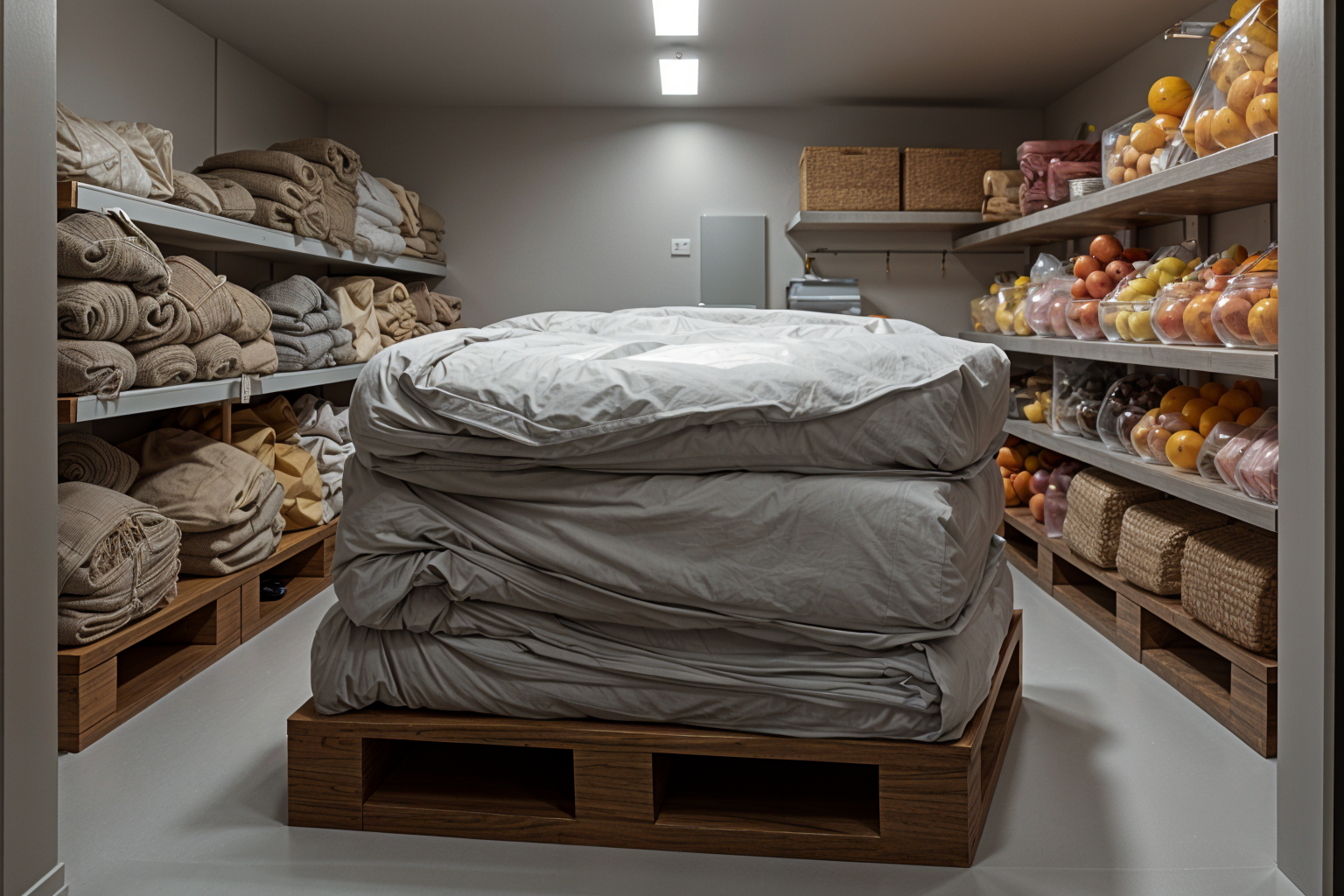 a large interior of a refrigerator camera filled with fruits in bags wrapped in transparent plastic on wooden pallets large package of fruit sacks in transparent plastic