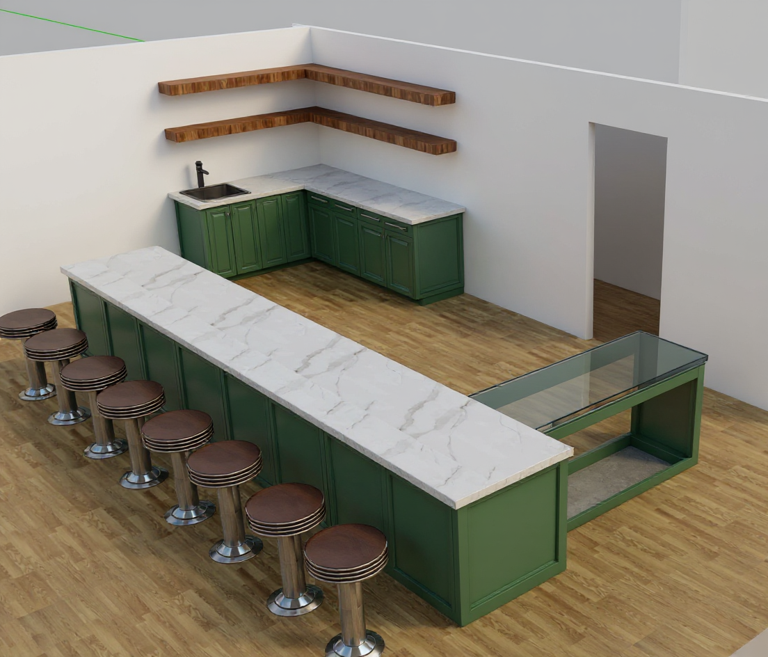 the part of the cabinet with a glass front also has a glass countertop make sure they are glass the other countertops are white marble with grey veins mainain colors there is no waterfall element to the marble countertops it is green cabinet to match on the sides of the long cabinet use the green color as shown in my original concept drawing make the cabinets an grey green duskier match the color of dunn edwards bijoux green de6266 but more grey and duskier even more grey like army green make the color lighter and less vibrant make the floating shelves light walnut