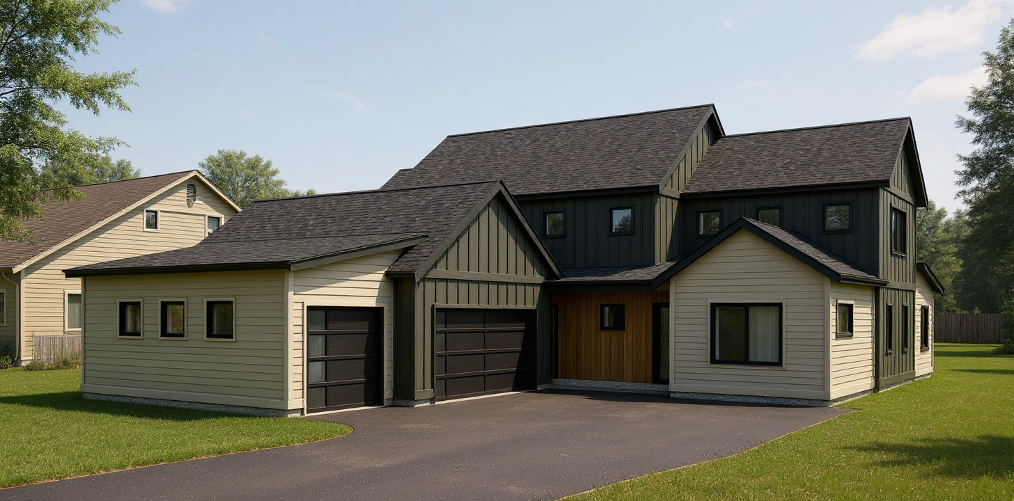 dark greenish gray board and batten siding mixed with light beige lap siding and vertical wood siding at the entry driveway is asphalt roof is black asphalt shingles setting is a suburban lot no other houses are in view add shrubs around perimeter