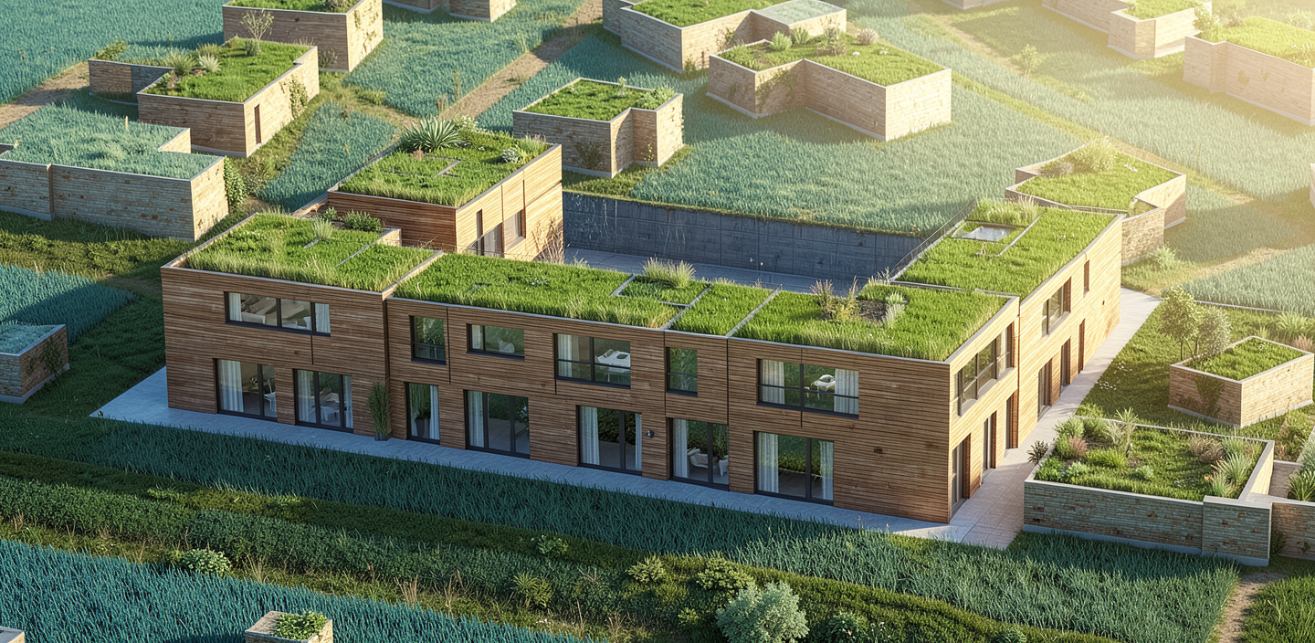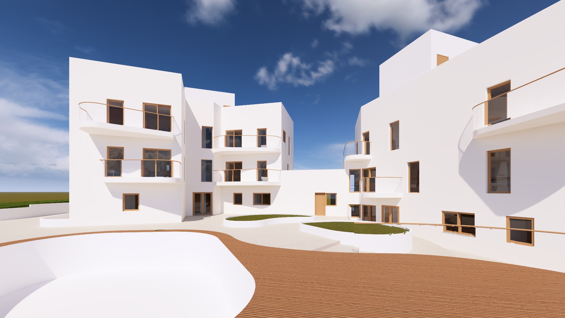3d architectural rendering of modern multi story buildings with a vibrant natural setting use soft beige for the building exteriors with dark gray accents for windows and balconies accentuate with lush green trees and shrubs surrounding the structures and incorporate a clear blue sky for a bright and inviting atmosphere set in a gentle hillside landscape with subtle earth tones add dappled sunlight to enhance depth and realism include elegant curved pathways with light gray pavement for a harmonious balance
