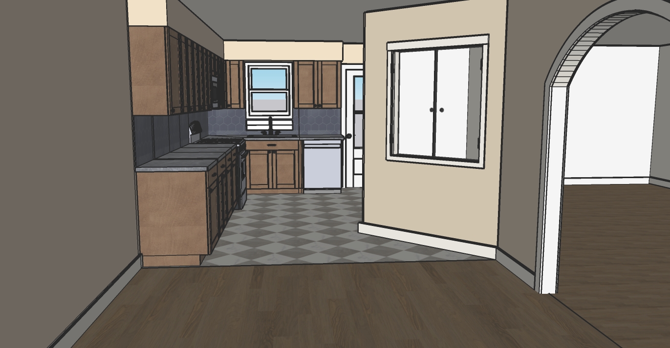 the cabinets are a maple wood the countertops are a grey granite the floor in the kitchen is an off white and taupe bronze checker tile floor the hardware is bronze the backsplash is a navy hexagon tile the outside environment is a small back yard with a tree the front part of the floor is medium honey hardwood add brightness like there is a ceiling light on