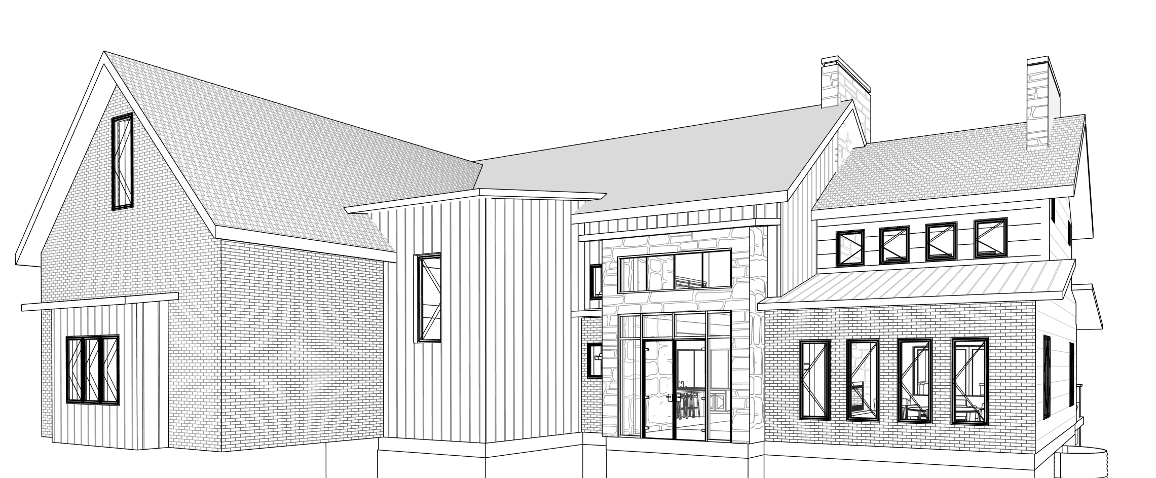 modern farmhouse look with black siding white brick and stone asphalt shingles on the roof