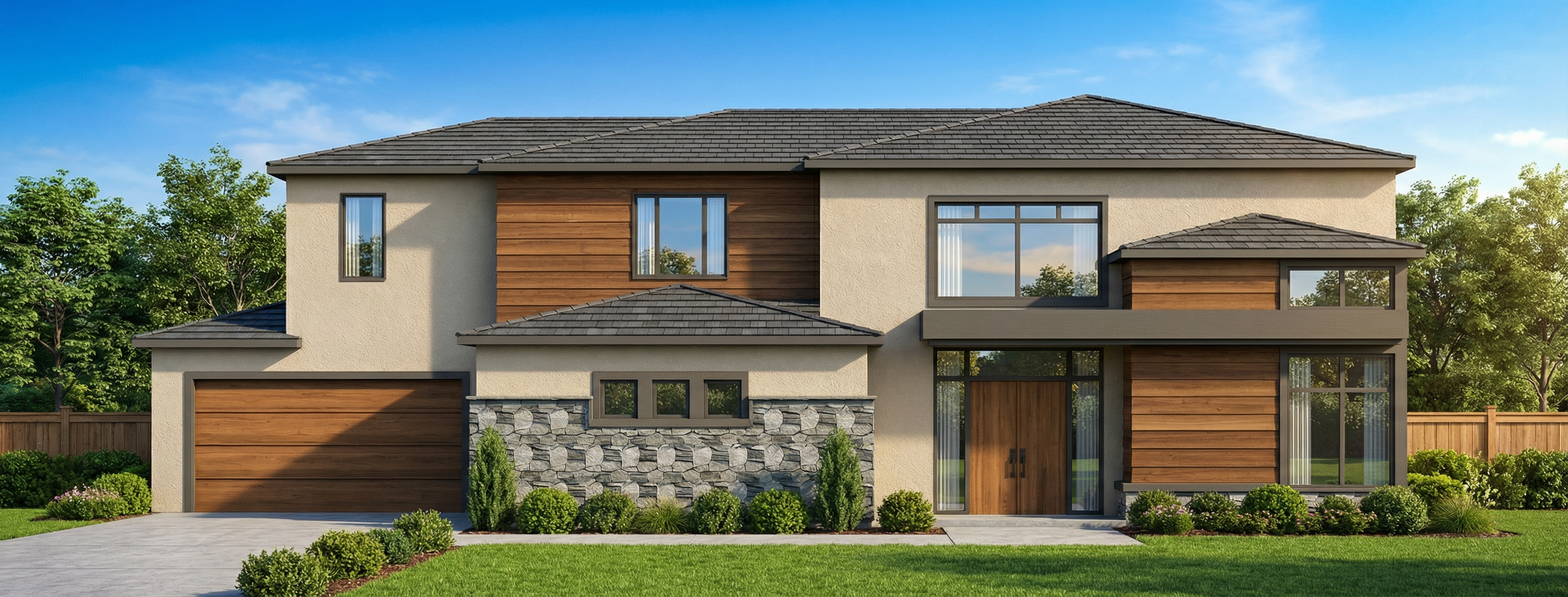 photorealistic render this image use large format sandstone color matte tile on the shower walls matching hex tile on floor large glass shower door on left white dove recessed lighting daytime