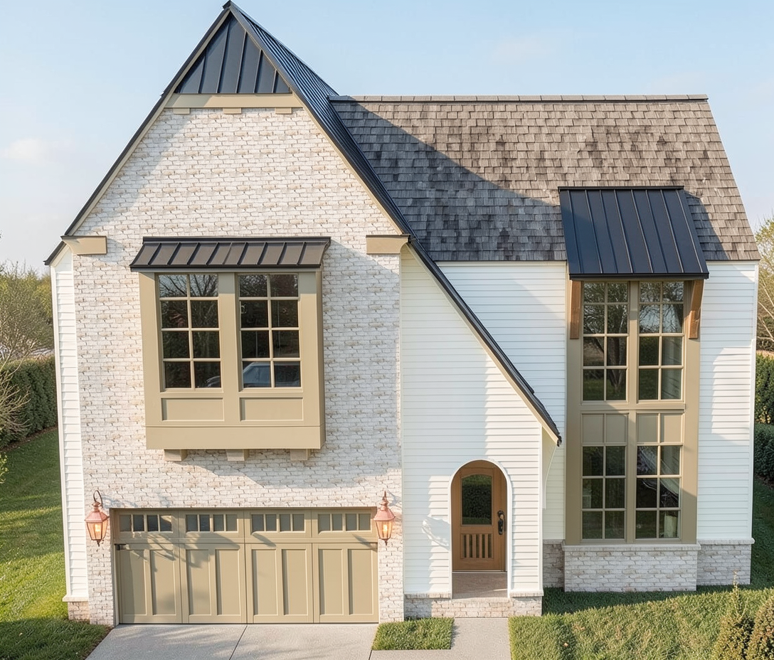 render a hyper realistic modern high end contemporary three story house in florida setting where there are palm trees and the lights are lit up on the outside of the house the window frames are light gray maintain the window design where there are shutter design on left and right side the garage door is a sleek modern design in matte gray with wide horizontal panels and narrow glass inserts that create a clean contemporary look while letting in controlled natural light the roof is gray metal roof featuring a mix of gray brick white stone featuring large windows the exterior features an accent of bricks exterior wall clad in light gray linear stone veneer the stones are long narrow and horizontally stacked with tight joints creating a sleek contemporary texture subtle variation in gray and white tones adds depth without looking rustic the surface is matte with crisp edges and a refined architectural finish located on the left center where the 3 windows are located and it wraps around on the left atleast 1 foot the finishing around the garage doors are light bricks that are stacked linear gray stone veneer with a mix of cool toned shades tight horizontal joints and a clean contemporary texture modern residential entrance featuring a rectangular arch clad in smooth light colored panels with crisp vertical lines a dark horizontal overhang frames the main door is 6 feet wide made iron it has full glass lite frosted glass no mulls the trellis are all in gray the walls are a soft light gray with a smooth finish creating a serene and inviting atmosphere with lots of greeneries and landscape and with dramatic sky