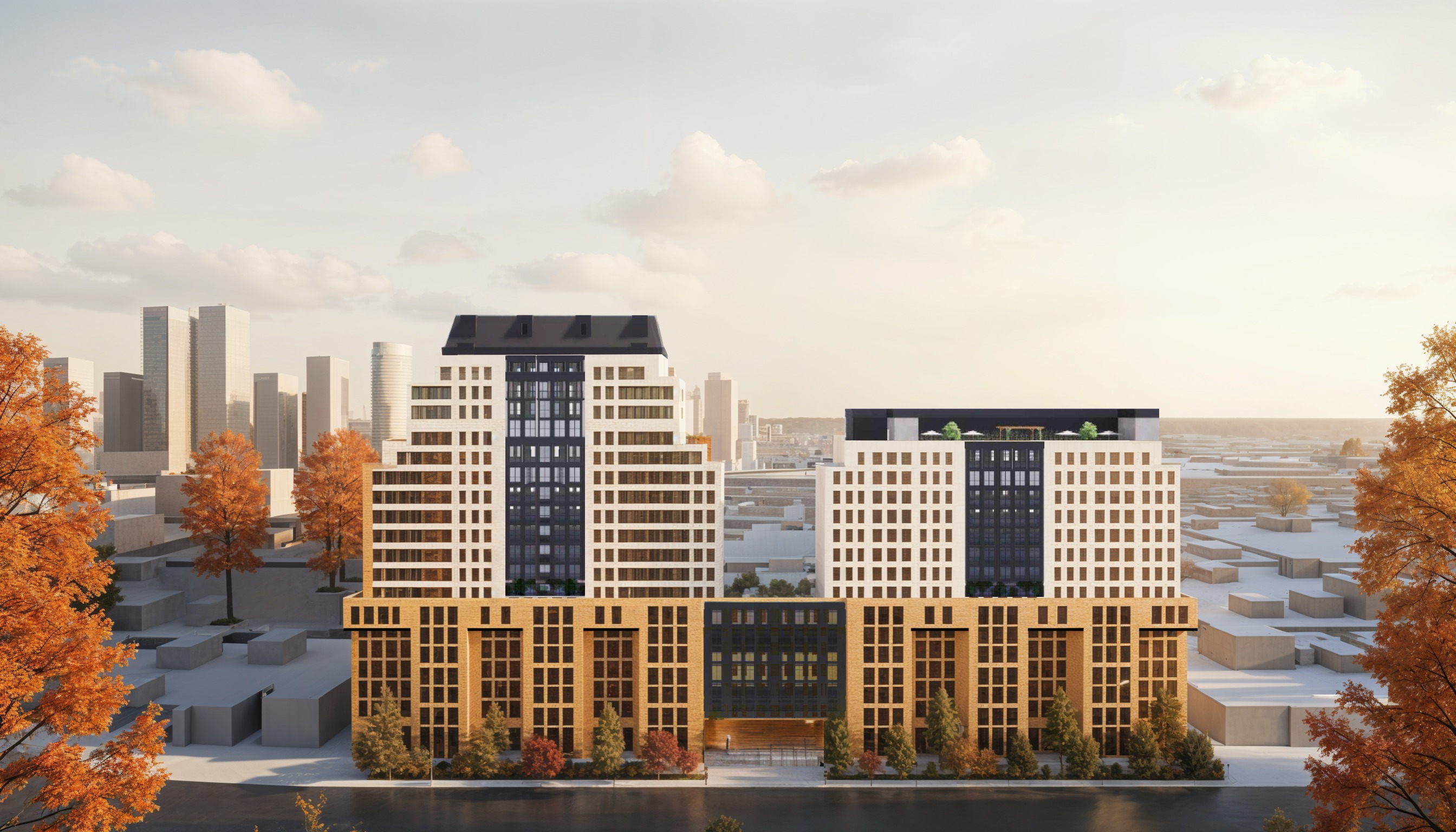 make this a more photo realistic scene with real building material finishes soft afternoon lighting trees in the background