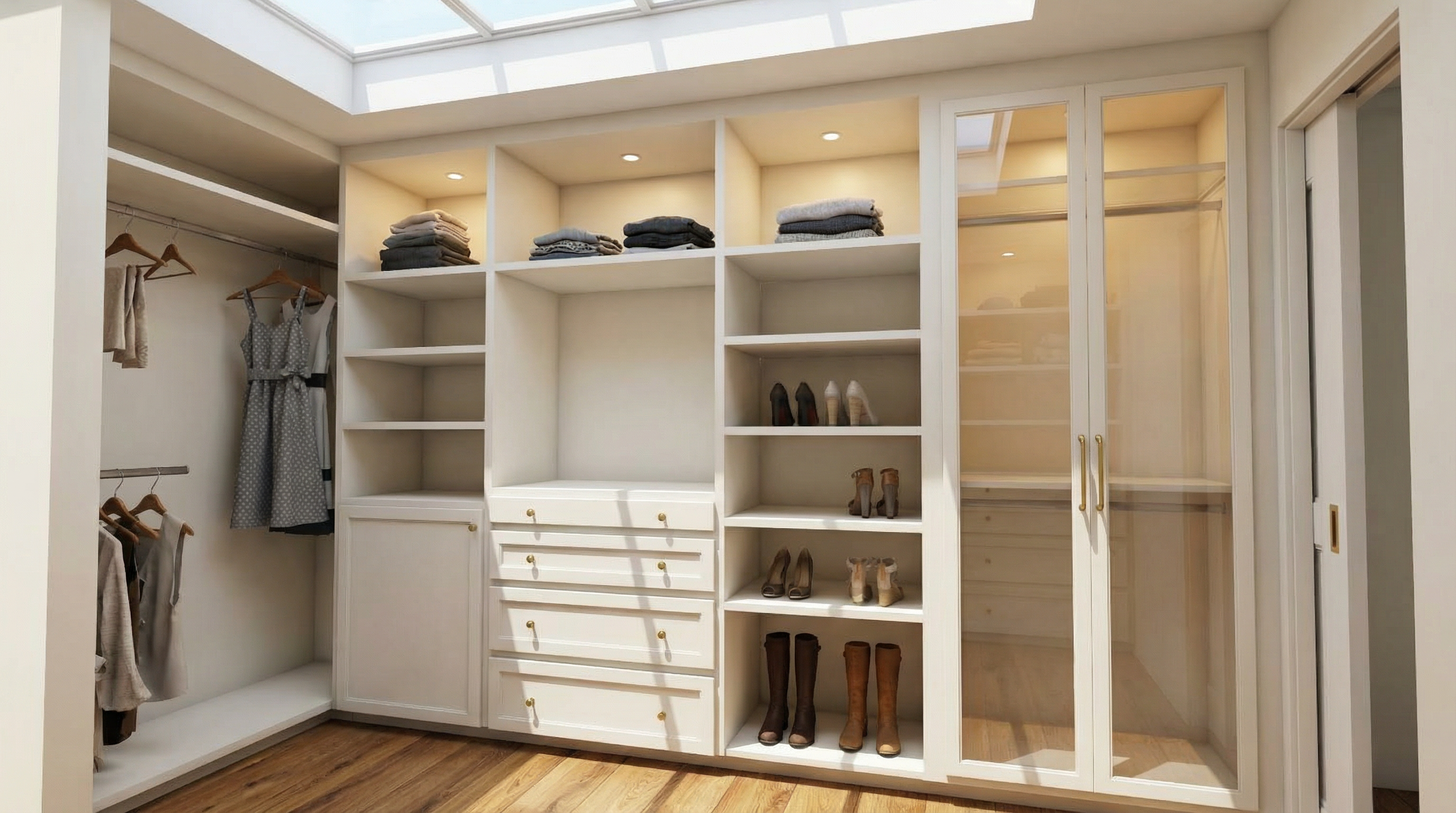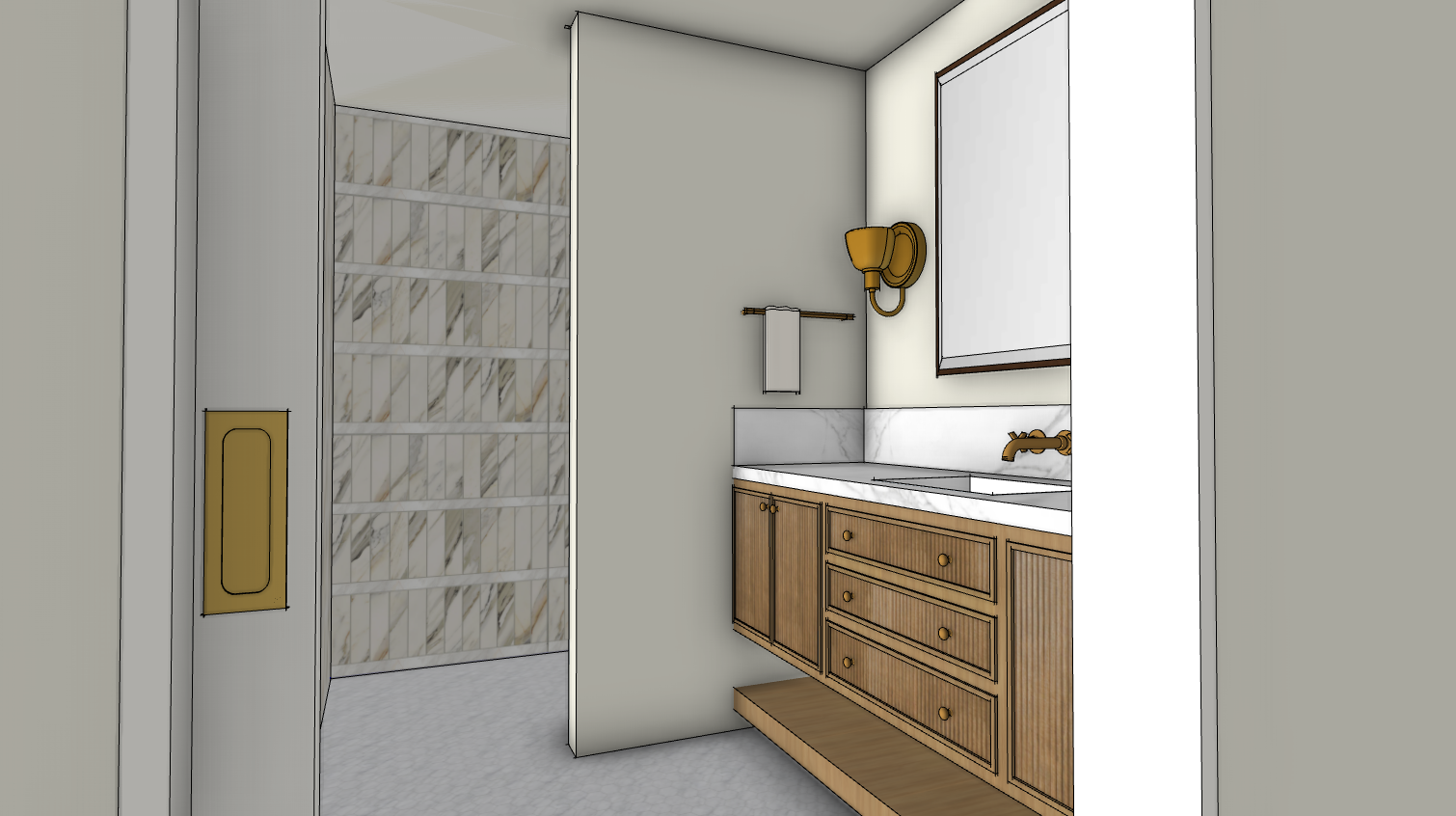 create a high quality photorealistic interior rendering from this sketchup model preserve all existing geometry proportions cabinetry details and fixture locations exactly use soft natural daylight with realistic shadows and subtle contrast materials should appear true to life warm natural wood vanity with visible grain honed marble countertop and backsplash with soft veining brushed brass fixtures with gentle reflections and matte painted walls avoid overly bright whites or washed out colors edges should be slightly softened and realistic not sharp or cartoon like do not add or remove elements do not change layout or finishes clean calm high end residential bathroom aesthetic add subtle ambient occlusion for depth