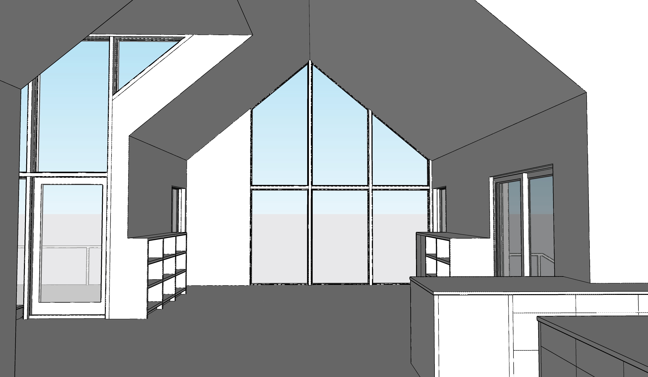 interior all walls and all ceiling are beautiful light washed european white oak floors are a small aggregate polished and waxed concrete of a muted beige color like a sand beach view through windows is the wisconsin side of the st croix river bluff countertops are a buff color stone cabinetry is white oak to match the walls and ceiling