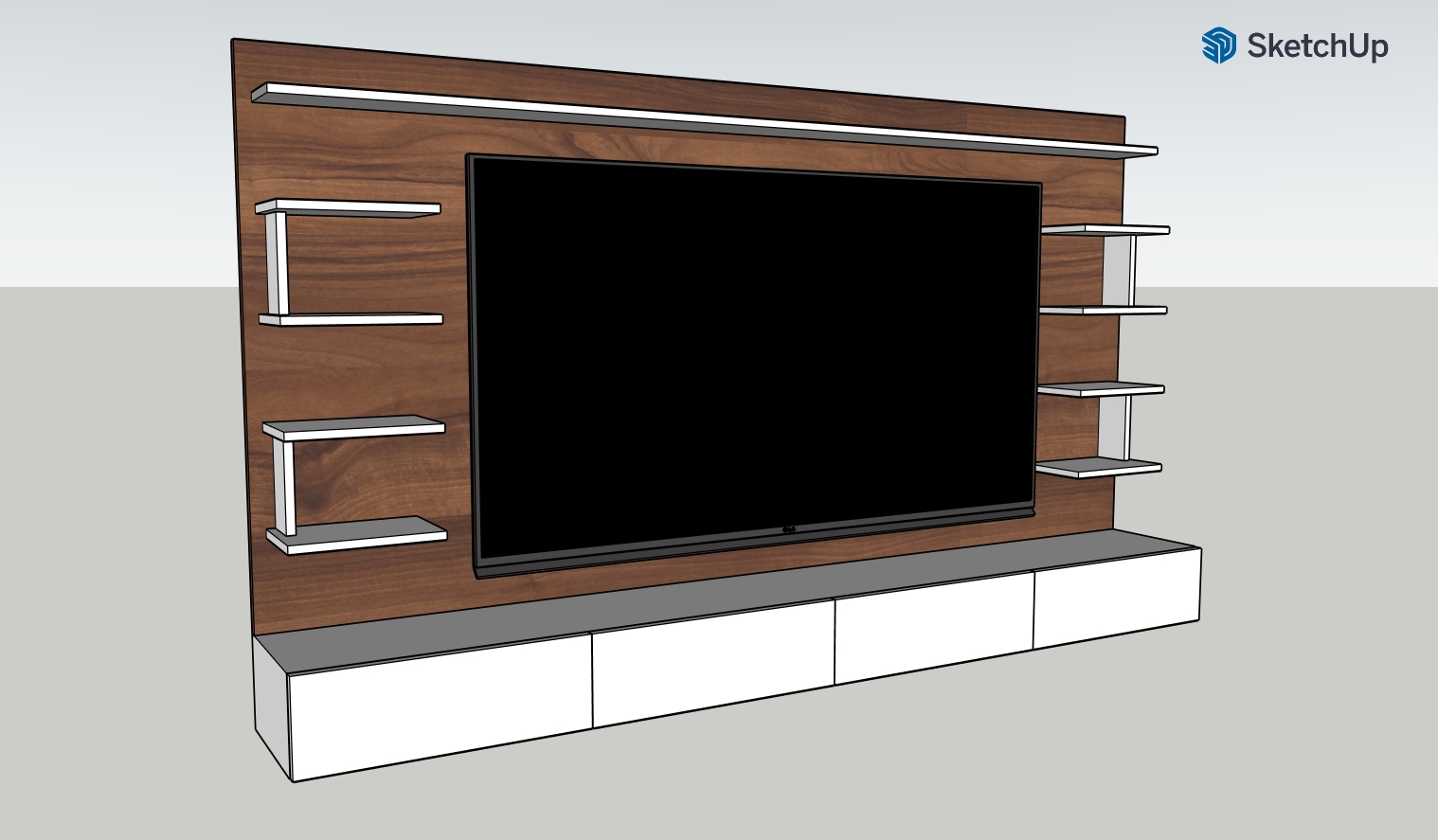 the picture is of a tv unit with a tv 65 tv in the centre shelves left and right and a four door cabinet below please do a photo realistec render of this unit