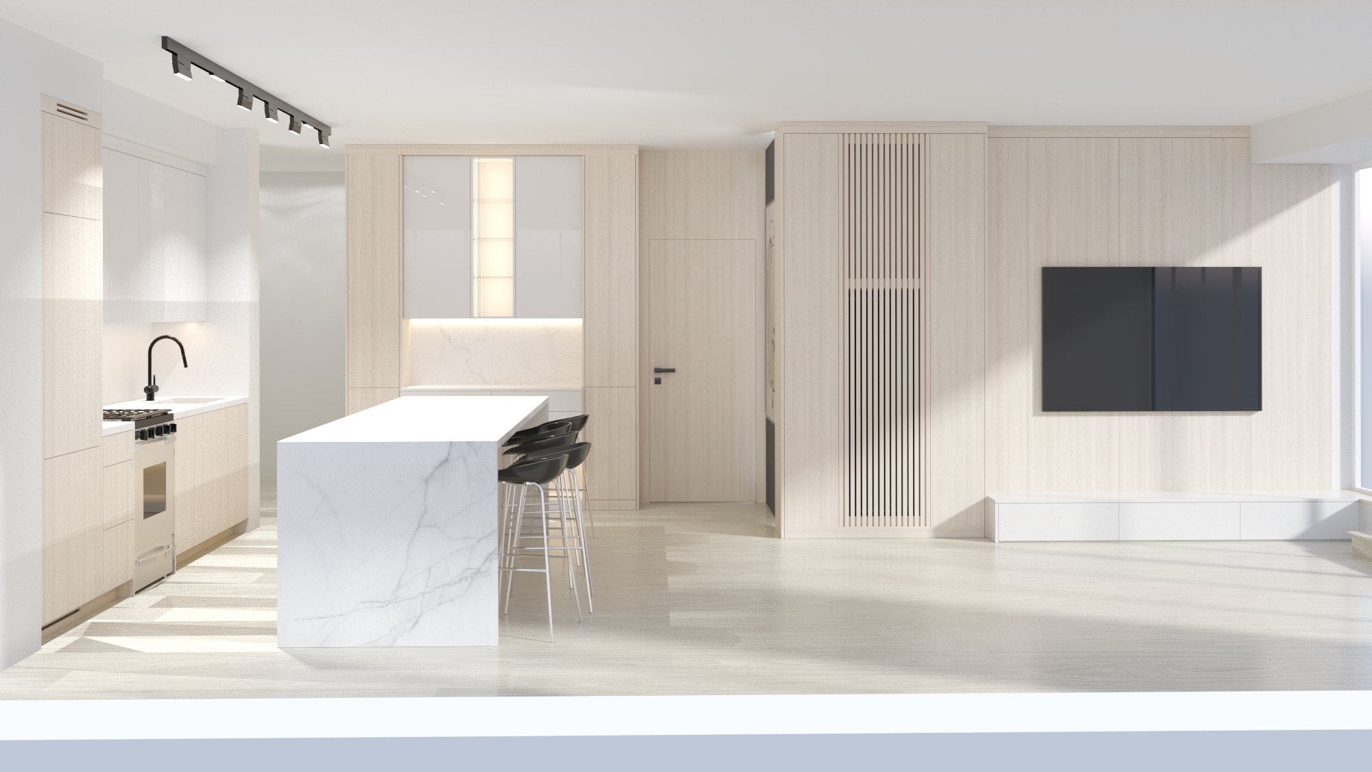 a luxurious and serene kitchen the atmosphere is calm and inviting with abundant natural light filtering through the window casting gentle shadows also is sunny day realistic picture