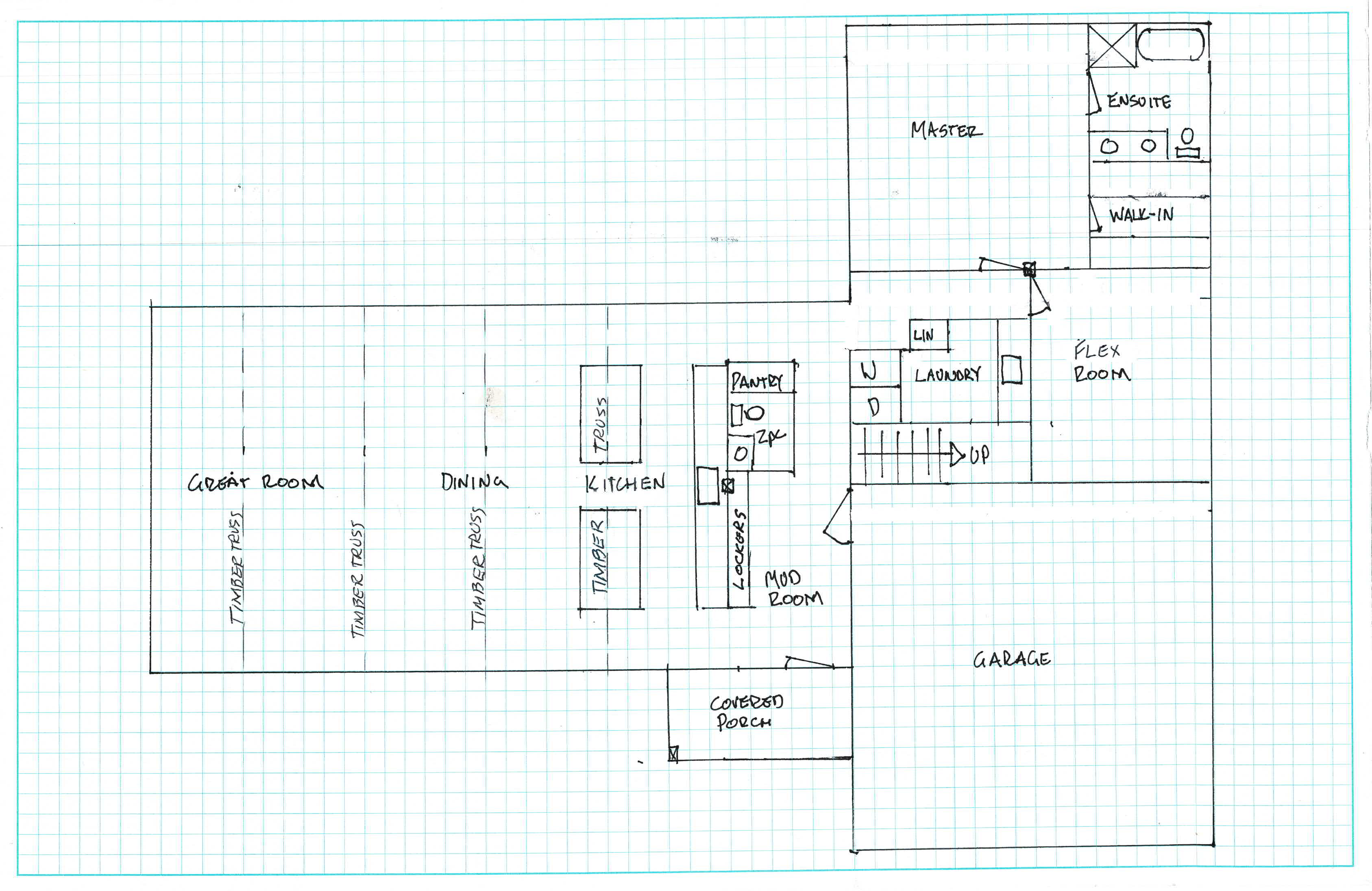 create a simple 2d black and white cad style line drawings of this floor plan sketch convert the written words to text