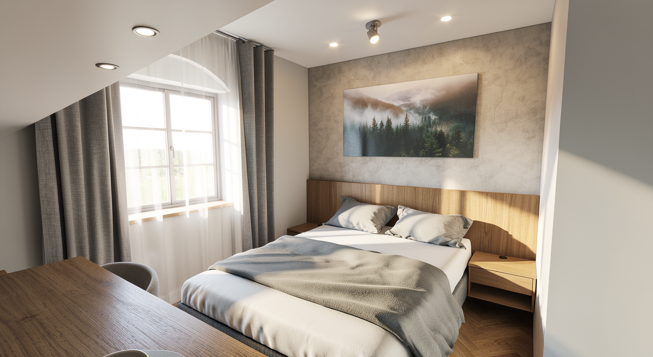agrega cortinas unicamente a la ventana derecha que vayan desde el piso hasta el techo en tonos muy claros con movimineto y forma natural conserva los mismos elementos que se muestran en la imagen original no cambies nada elimina las lineas negras