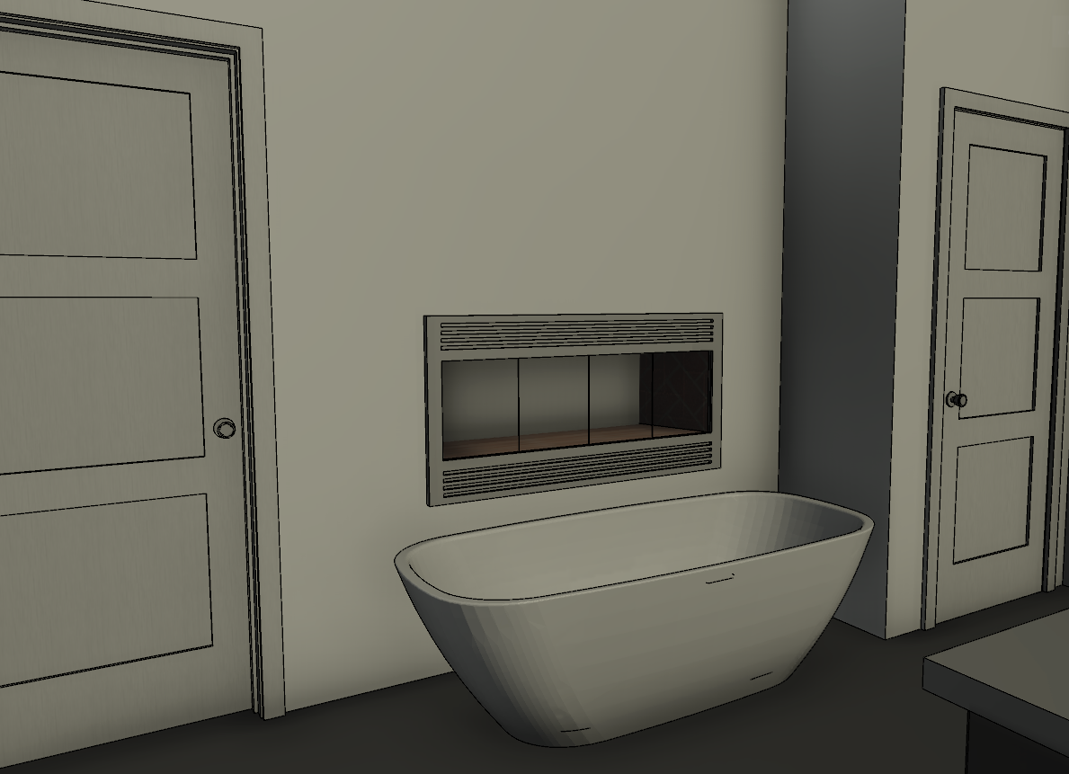 add black polished marble tile around the fireplace all the way up the wall and on the floor add a black deck mount faucet to the tub