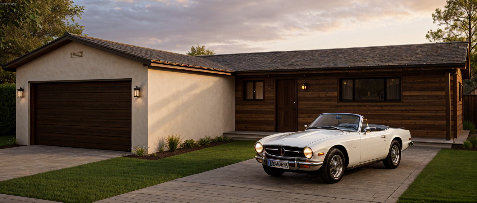 a modern two story house with a sleek contemporary design the fa ade features board and batten siding in muted olive green and warm beige lap siding creating a harmonious co the entry has vertical wood siding the roof is a matte charcoal gray providing a neutral yet elegant finish the garage doors are black complementing the window frames which are black the windows are large allowing for ample natural light the setting is a peaceful suburban environment with lush green lawns and a clear blue sky giving the scene a calm and welcoming atmosphere