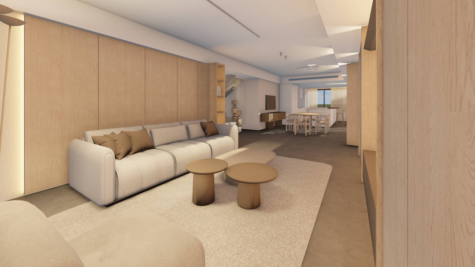 render this image in a realistic style maintaining the exact same composition furnishings lightning and design without adding or removing elements the floor is gray ceramic like polished concrete and the wood is light brown almost desaturated the low tables are brown without wood texture