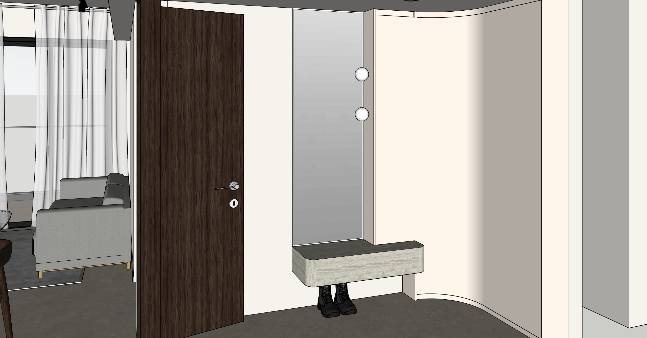 the cabinets are in a light beige solid colour the floor is light beige granite the ceiling is white the spheres are lights the settee is travertine laminate the walls are white there is a white frame around the mirror