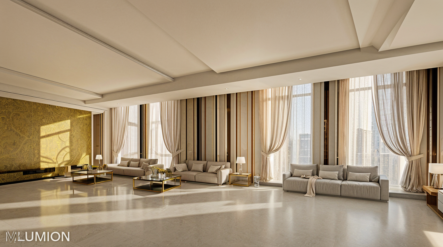 add people in business suits add high ranked marines in green service alpha uniforms add small drones and weapons on the horizontal slat wall on the left side of the image no furniture