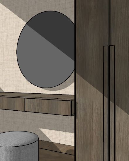 archsynth prompt image type hyper realistic interior architectural render editorial style scene framing maintain exactly the same composition crop camera position and proportions as the reference image close up frontal view eye level neutral lens 35 50mm no distortion critical corrections very important sketch lines must be removed all visible black contour lines come from the sketch model and are not real shadows or material edges do not reproduce any outline contour or graphic edge all edges must be defined only through natural light shadow and material transitions wardrobe handles very important handles are not metal elements they are simple rectangular wooden pieces integrated into the door design same material as the wardrobe wood matte finish same tone same grain minimal clean geometry no contrast or visual emphasis materials consistent refined realism wardrobe wood natural wood same tone as reference soft grain slightly irregular matte with very subtle reflectivity tactile slightly rough surface no artificial contrast on edges vanity wood same material language and tone as wardrobe continuous calm natural wall textile organic textile surface fine uniform texture warm beige tone no seams or repetition artifacts mirror clean circular mirror subtle warm perimeter backlight soft halo integrated and elegant accurate reflection floor wood herringbone natural wood parquet matte soft reflectivity realistic grain pouf grey fabric matte soft volume lighting preserve original maintain the same daylight direction and shadow composition diagonal sunlight across the wall and furniture no changes in intensity or mood mirror backlight remains subtle color atmosphere warm neutral palette wood tones beige textile soft greys calm editorial refined style high end architectural interior photography minimal elegant material focused no graphic or illustrative qualities quality ultra realistic high resolution physically accurate materials pbr clean global illumination no noise no artifacts restrictions do not include outlines or sketch lines do not interpret handles as metal do not exaggerate textures do not oversaturate colors