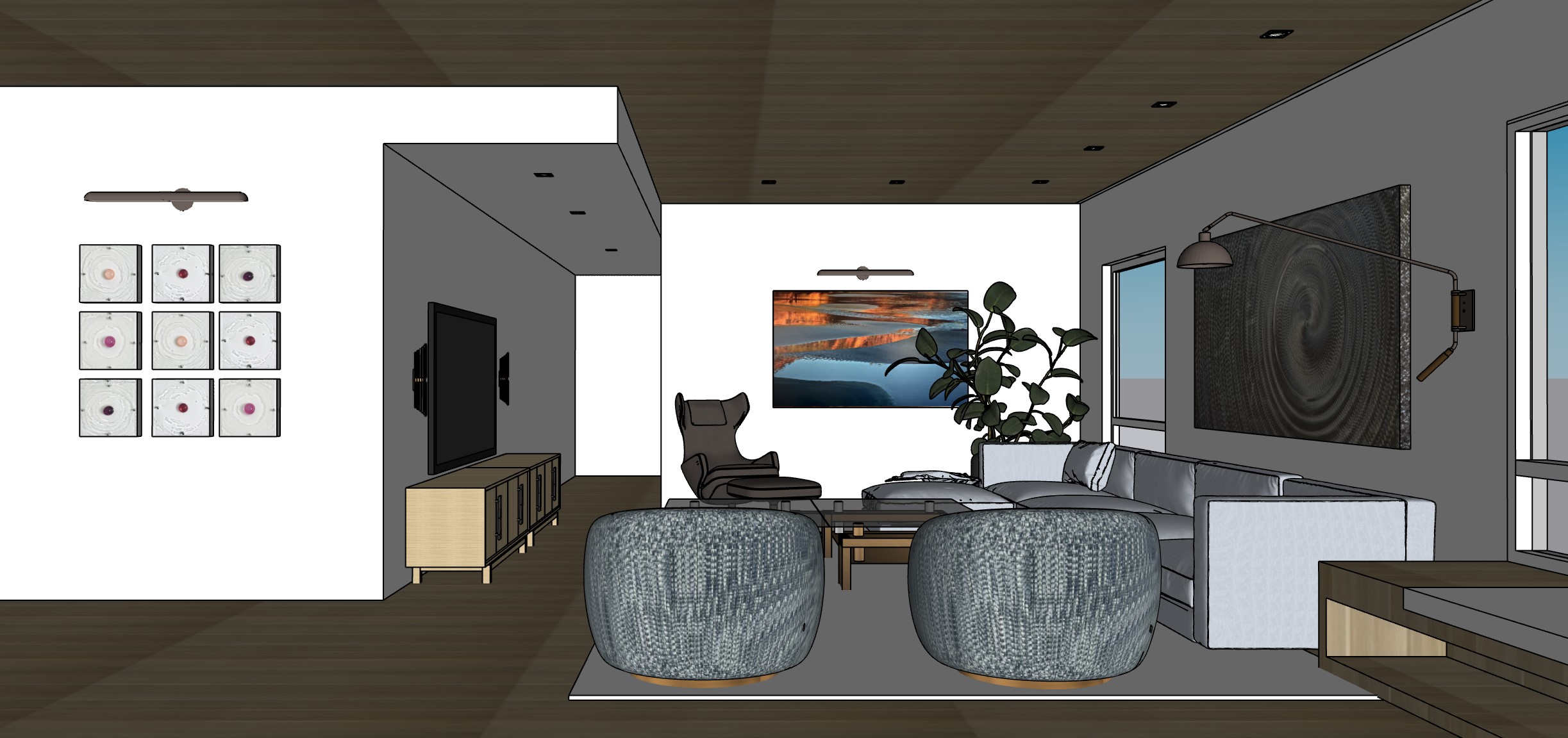 create photorealistic rendering of this living area with reading corner keep the bench design as is add books books in storage area under the bench and keep light oak floors add oak trees and landscaping to exterior keep swivel material light blue chenile and keep sofa a light grey color keep light oak flooring and light oak ceiling treatment only apply 1 blue vase to closest flat area of bench on right side keep window frames white keep front of second story floor riser white add low minimal wall lighting down hallway