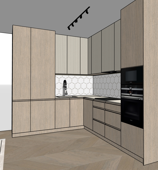create a beautifully rendered modern kitchen interior use light oak wood for the cabinets with a subtle grain texture the backsplash should feature a light gray hexagonal tile pattern for a touch of elegance choose a light neutral gray for the walls to complement the overall design the ceiling should be a soft white adding brightness to the space for the floor opt for a light gray wooden finish with distinct herringbone patterns incorporate sleek matte black appliances for a contemporary look the lighting should be a warm white creating a cozy and inviting atmosphere overall aim for a minimalist aesthetic with a calm and sophisticated ambiance render with exact materials and colours as this sketchup model fix the floor and add long window on the left