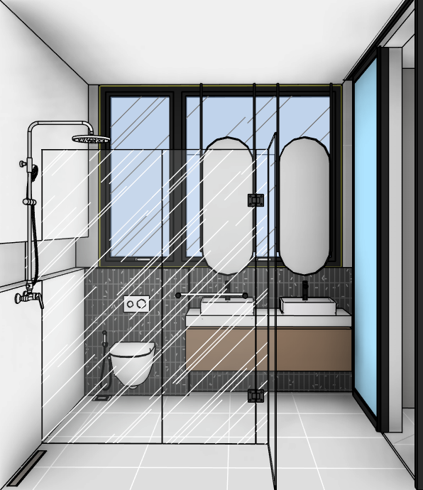 render bathroom interior with hyper realistic match the material quality lighting realism and mood 100 identical to the reference image use high end soft natural lighting coming from the window with subtle reflections and realistic marble textures style material wall tiles large format marble big slab with soft grey veins exactly like the carrara marble back wall hung closet and wastafel make material mosaic tile grey color floor tiles same marble tone and pattern as reference vanity floating wooden cabinet with smooth warm wood tone identical proportion style to the reference basin rectangular double basin with thick edges white stone material same as reference mirrors round black rimmed mirrors matching the reference window frame matte black aluminium all shower hardware matte black shower head hand shower mixing valve brackets rail exactly like the reference toilet wall hung white toilet clean minimalist shower glass frameless with minimal black hinges similar to the reference image niche inside shower area replicate the long horizontal soap niche from the reference