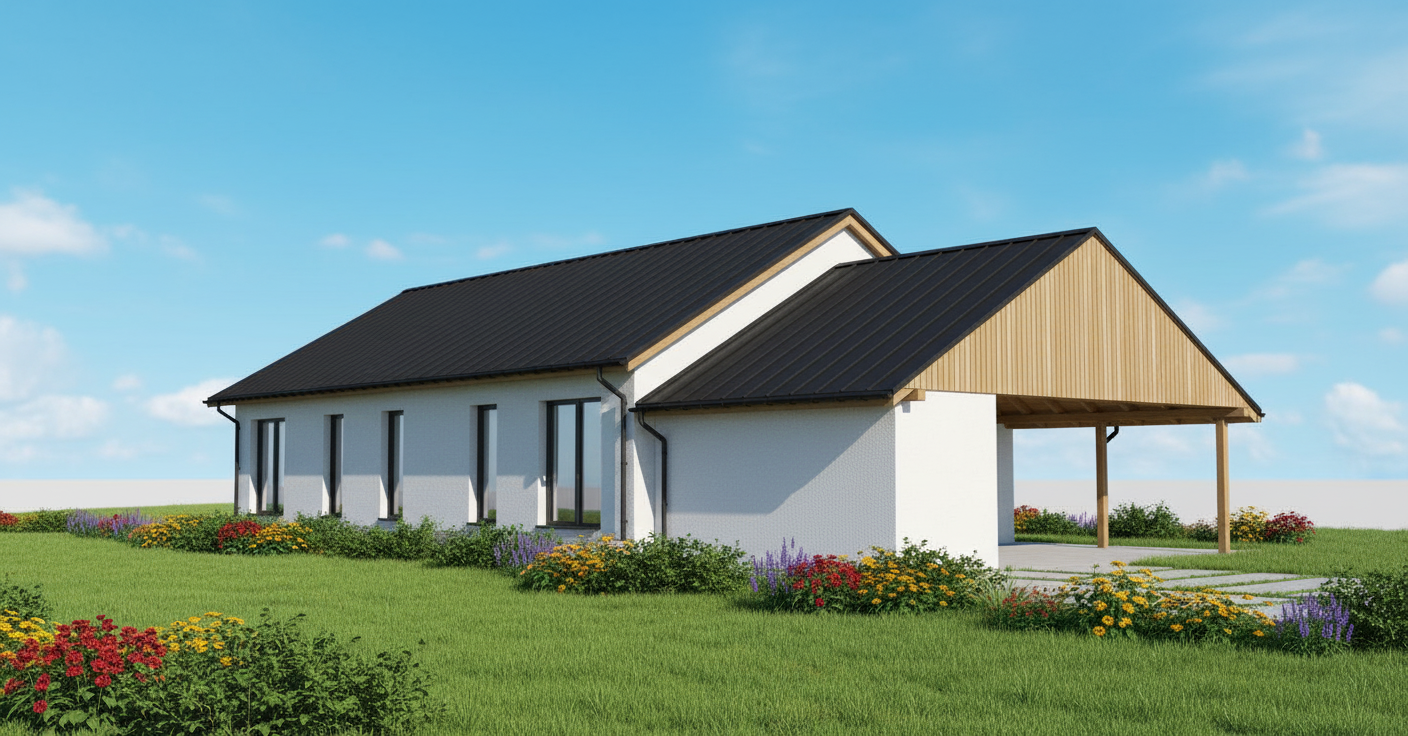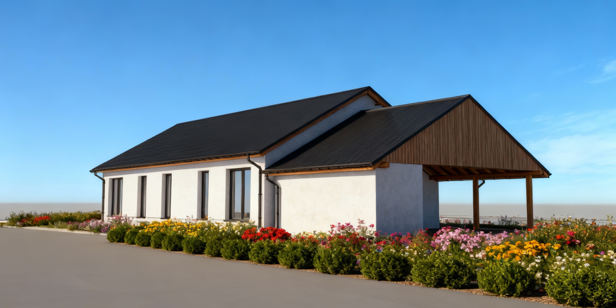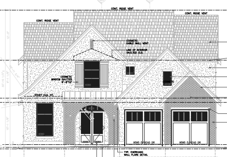 make this elevation into a realistic drawing the stucco is an off white color the stone is a light brown and grey coloring and heavy grout the roof is black shingles and the roofline trim is black the front door is brown and stained the garage doors are black the exterior lighting is a copper color