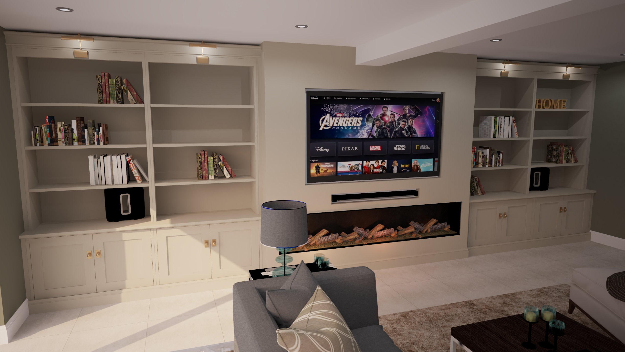 render family room with a rich elegant light warm and cozy atmosphere keep all colours do not change any cabinetry incorporate warmth