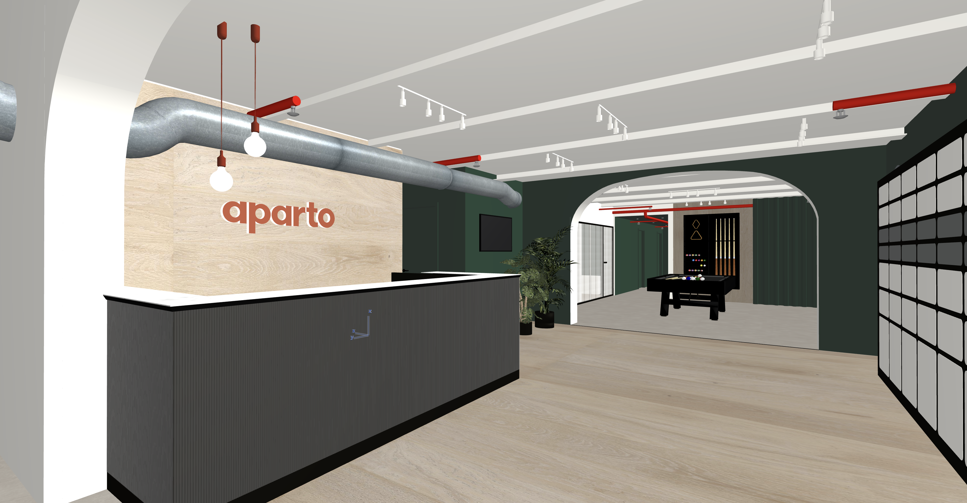 a terra abbiamo un parquet in rovere chiaro continuo dopo l arcata abbiamo un pavimento in linoleum beige chiaro il banco della reception in vetro cannettato con fondo specchiato e non ha le strip led da nessuna parte lo zoccolo della reception nero e anche il bordino sottile sotto la piana la piana del banco in graniglia bianca sopra la piana ci sono due lampade a sospensione accese dietro al banco la parete rivestita con lo stesso parquet in rovere chiaro continuo posato a pavimento con il logo illuminato sui bordi non ci sono da nessuna parte strip led come illuminazione metti qualche deplian e delle penne sopra al banco reception uno o due zaini per fare una zona conviviale e accendi la tv sulla sinistra il piano da gioco del biliardo grigio antracite la tenda in fondo di fianco al biliardo verde il soffitto bianco
