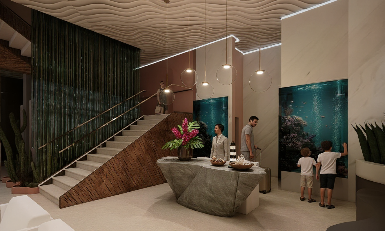 add people add vases and bowls to the coffee tables add people looking at the fish tanks