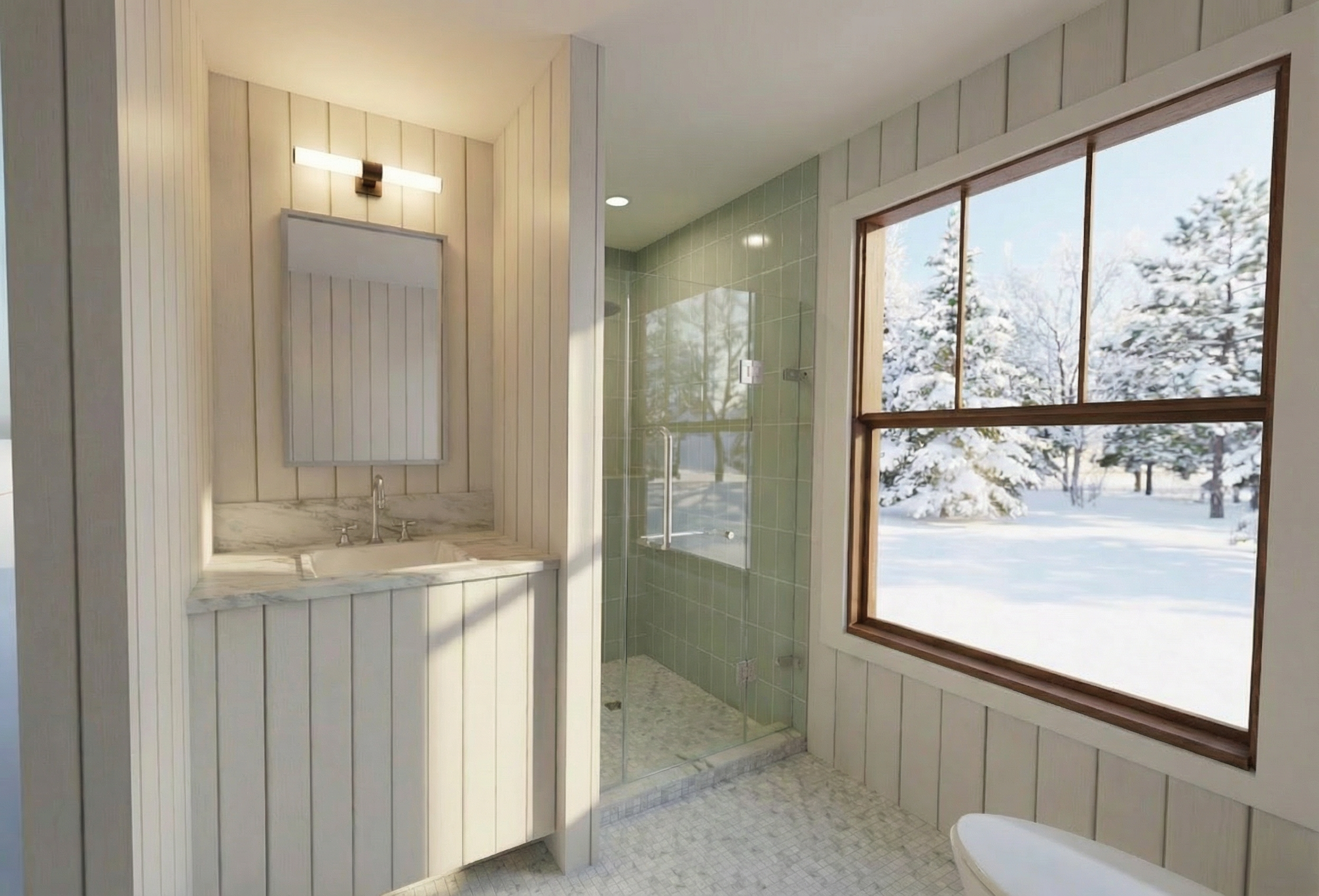modern interior shot master bathroom with light wood floating vanity blue marble tile in shower tub glass room architecture
