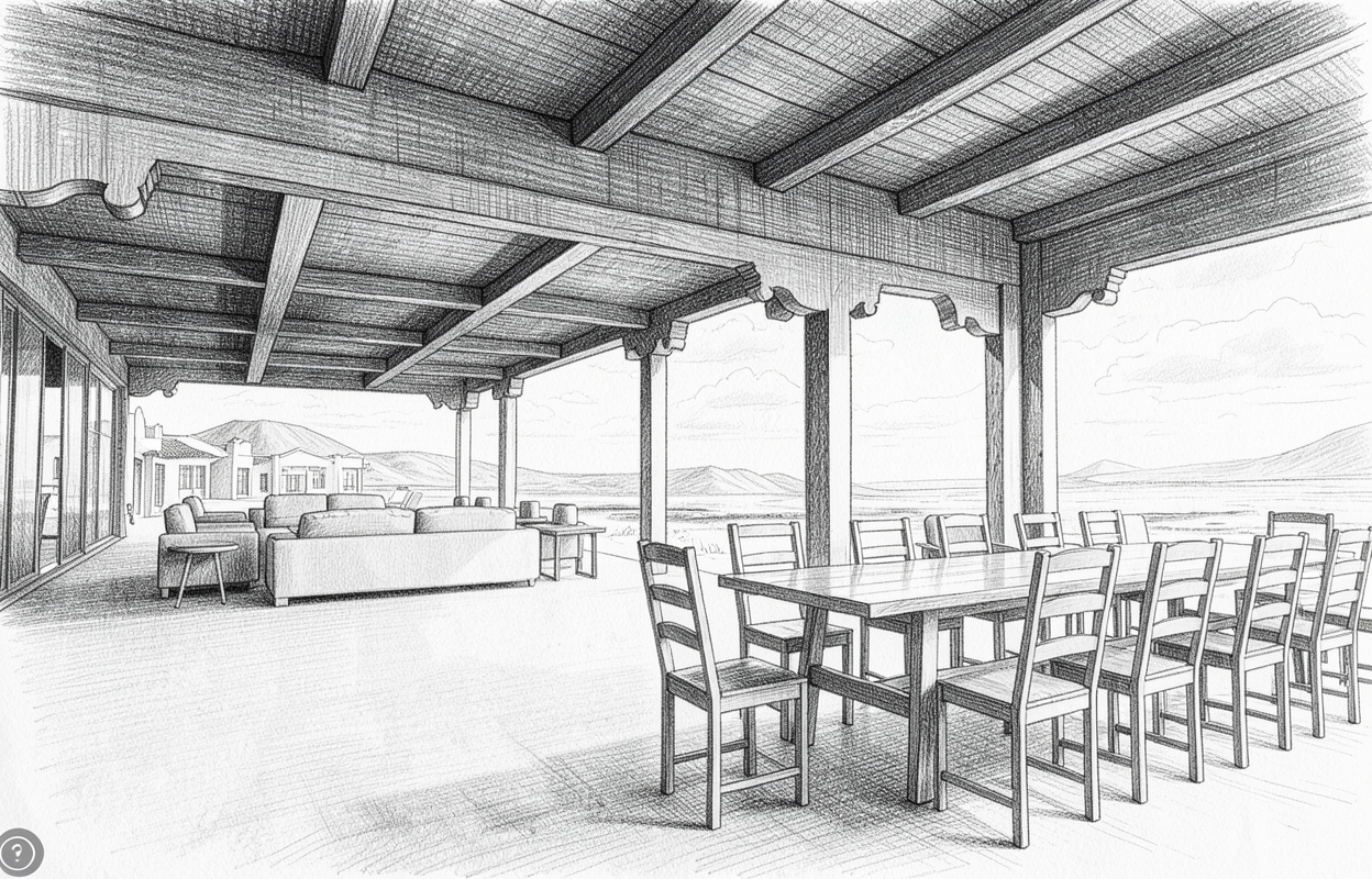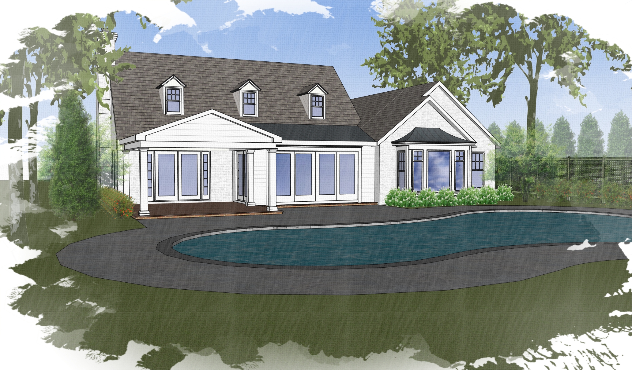 render to make look realistic white painted brick witch white trim soft lighting and overall cottage aesthetic siding above porch not brick and the pool in the forehground lightin not too strong