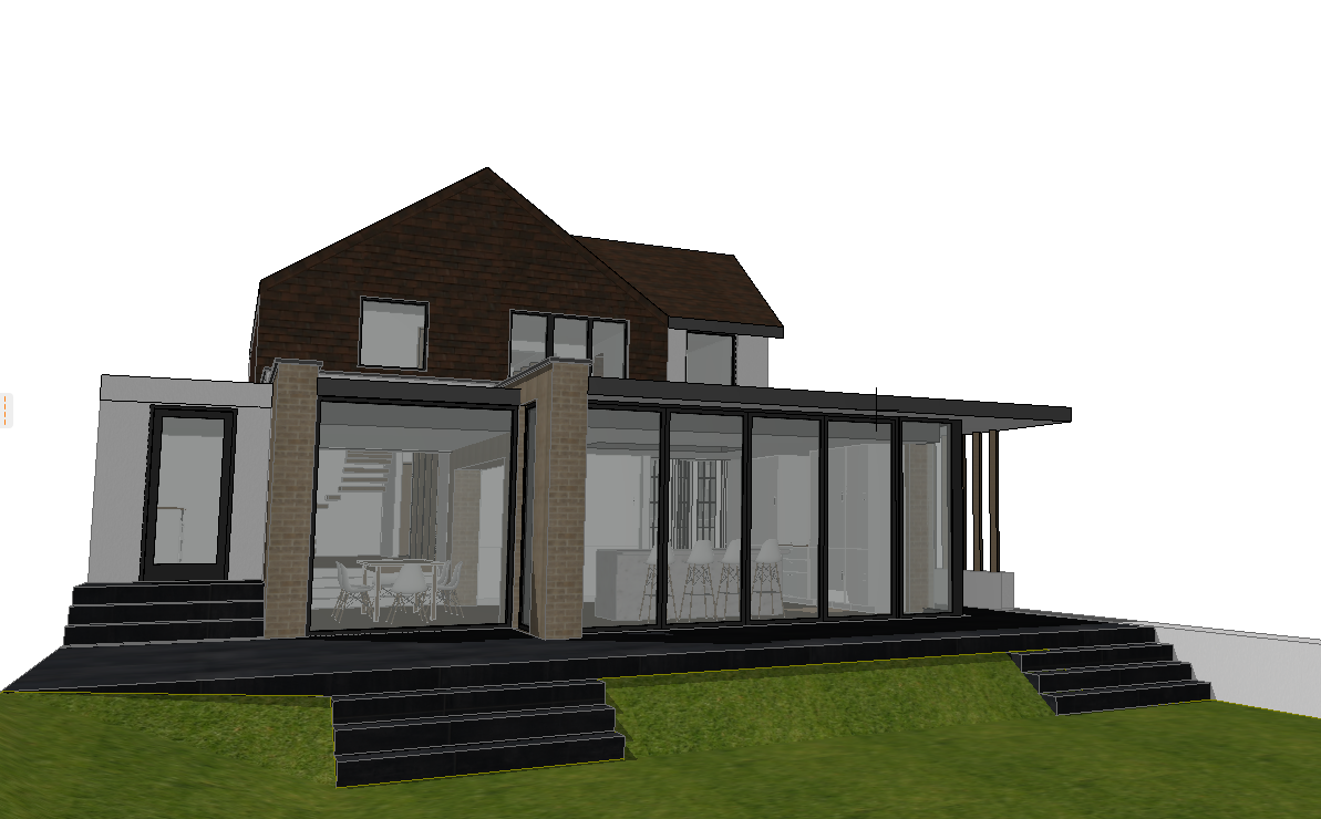modern house in urban area with brick houses either side house design with large glass windows heather blend tiled roof and vertical tile hanging and beige brick pillars black steps leading up to the entrance surrounded by lush green grass atmosphere serene and minimalistic with natural sunlight illuminating the glass facade warm earth tones for the roof and pillars contrasted by sleek black accents and vibrant green for the grass