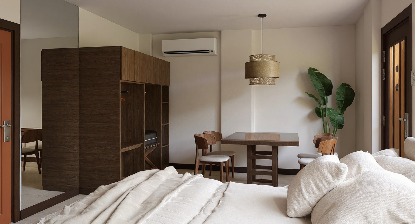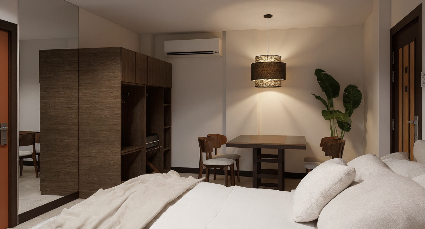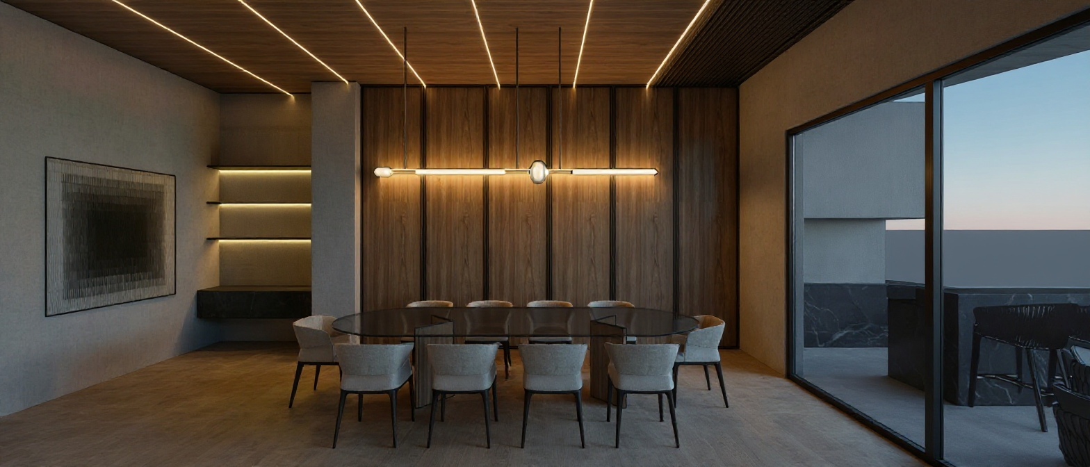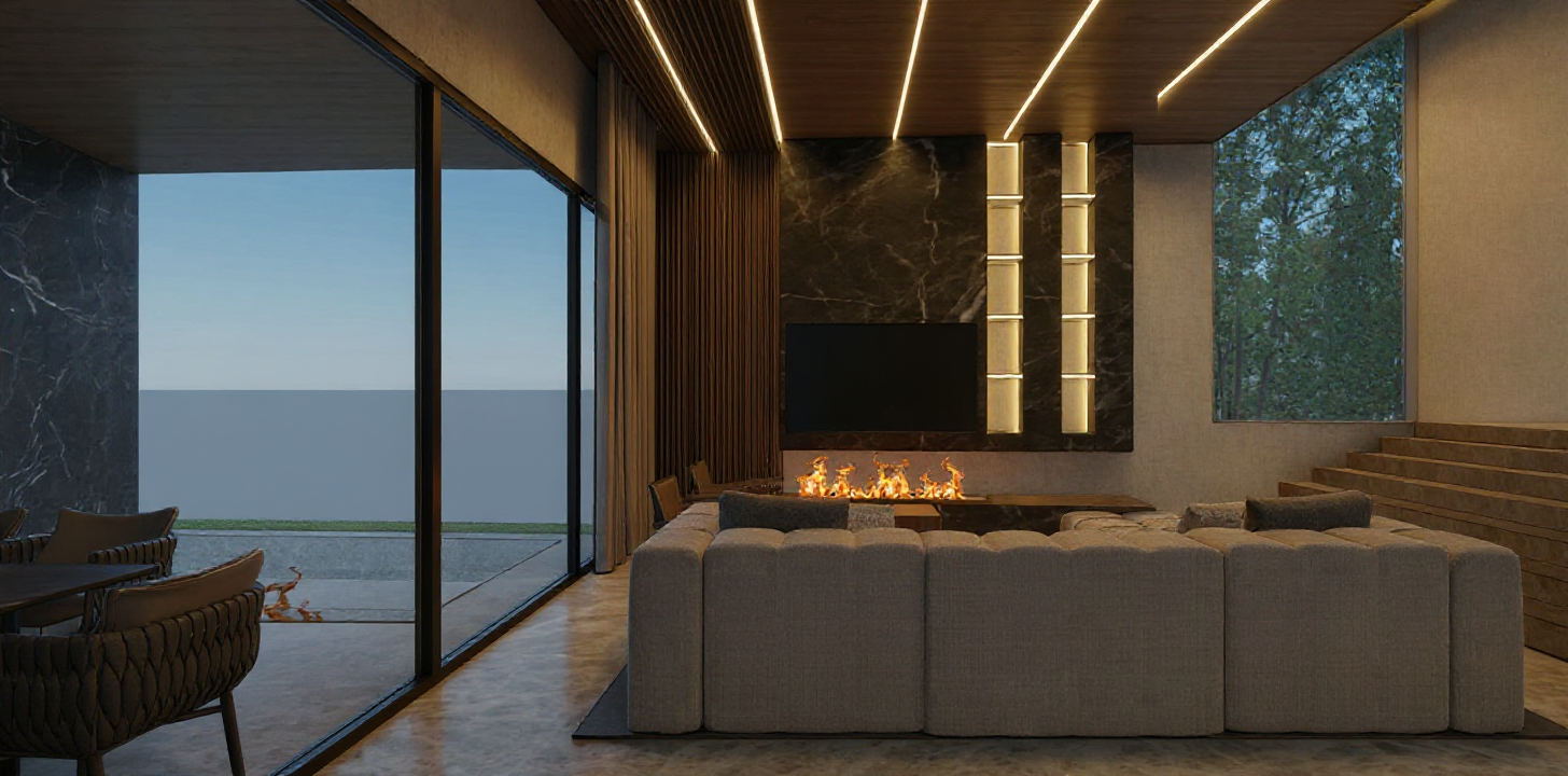 add line led lights on the ceiling cabinetes in kithcen have a solid backing shelves on the far left have a mirror behind them floor is marble make it during the brightest time of the day add forest trees in the background