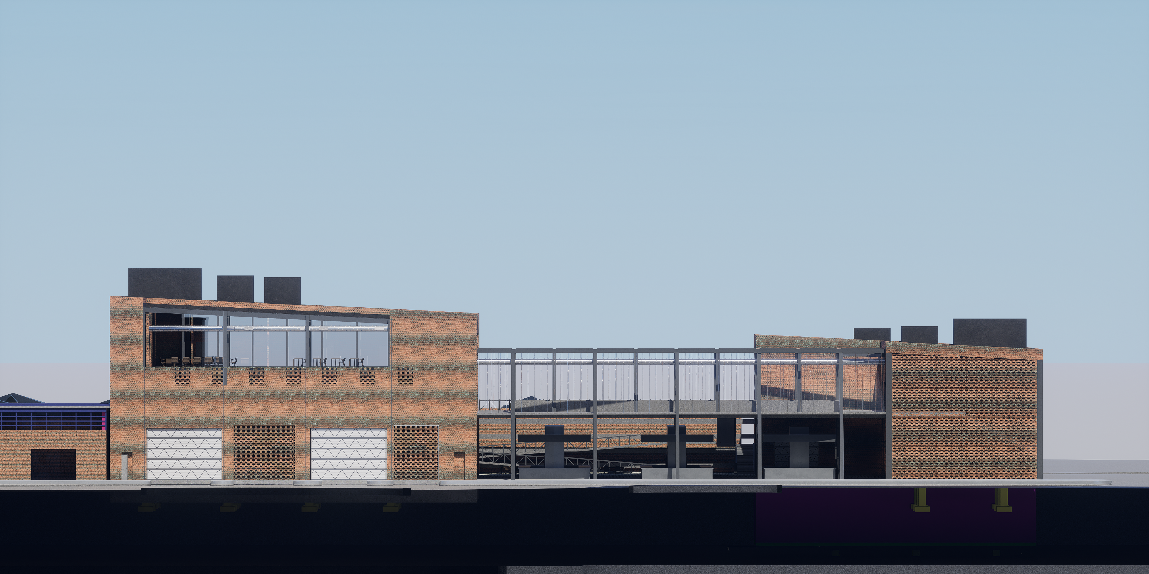 make this elevation look realistic take away footing add city background and clouds