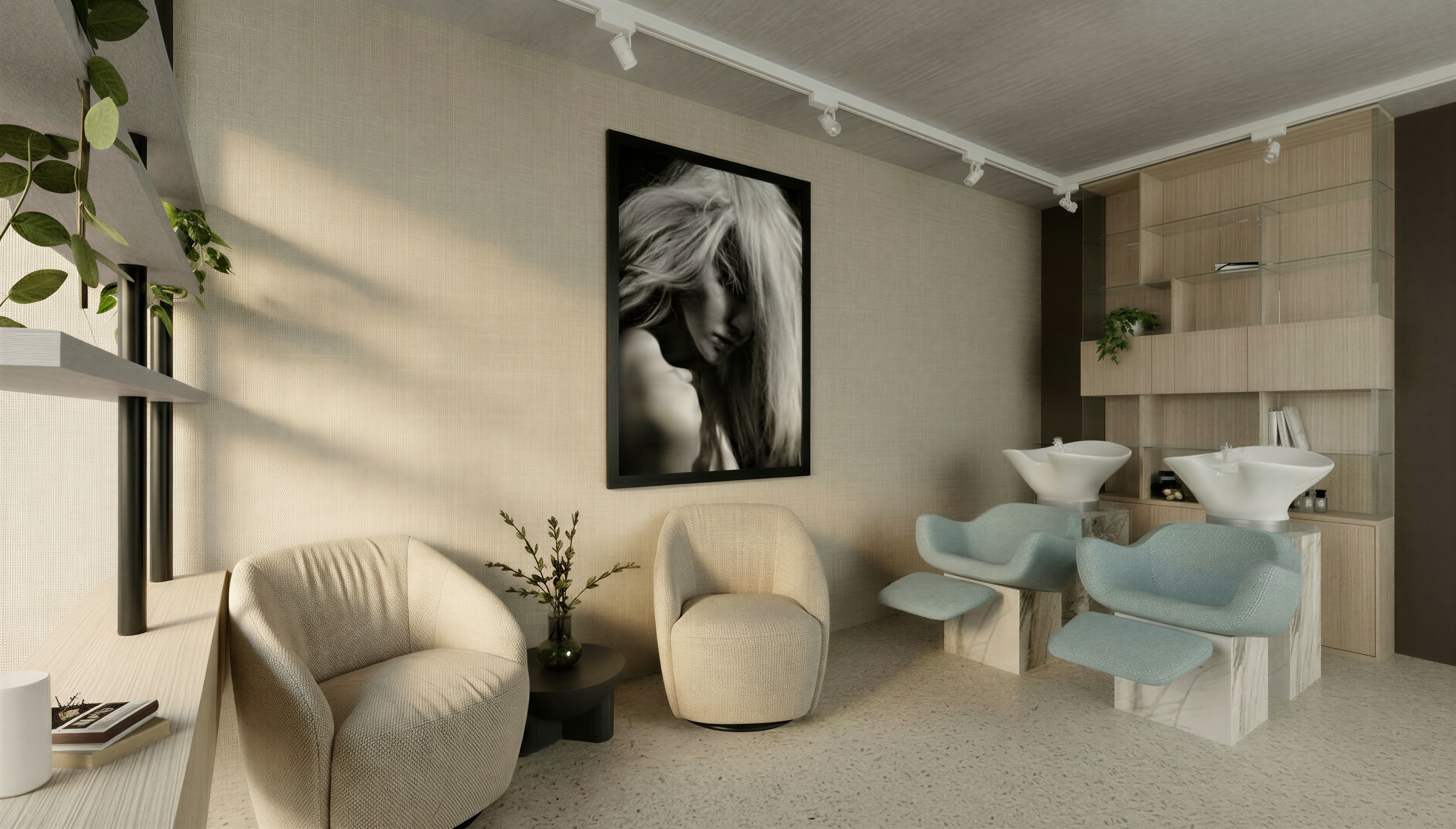 the floor is a vanilla colored terrazzo floor the ceiling is a concrete ceiling do not change anything else in the image