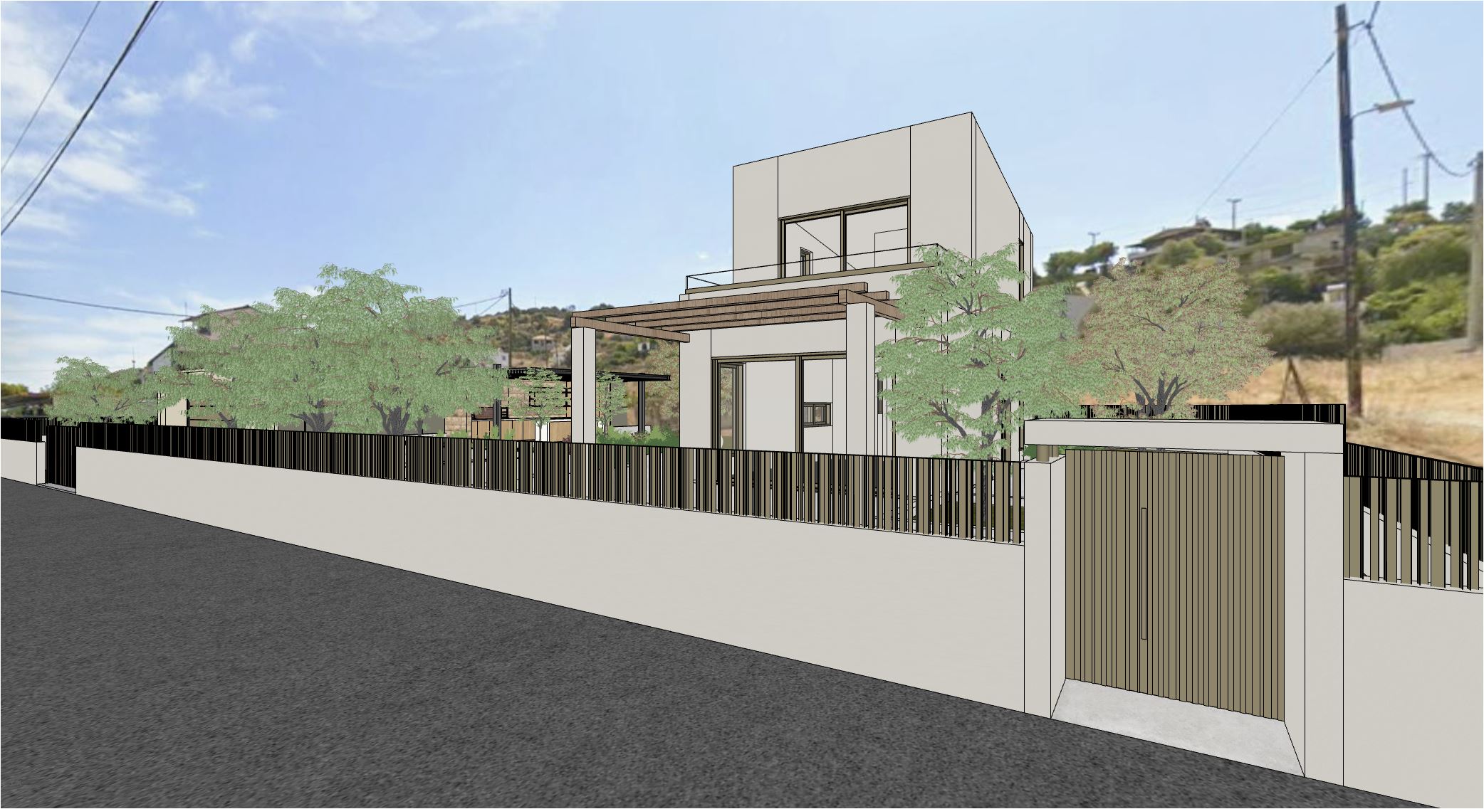 render a photorealistic 3d keep the same materials same walls same roofs dark brown window frames and metal brown fences native plants do not change the geometries and shapes keep this camera view of the model use warm mediterranean summer light late afternoon feeling put curtains behind closed windows do not change the geometries and shapes