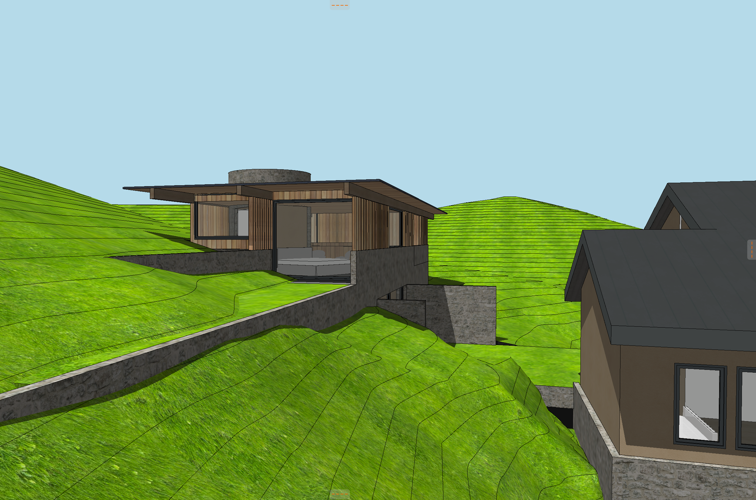 landscape hillside with sagebrush and tall wild grasses brown drystack stone walls corten standing seam metal roof interior walls to be vertical light wood fire in fireplace with person sitting on a rough cut stone hearth white fabric bed
