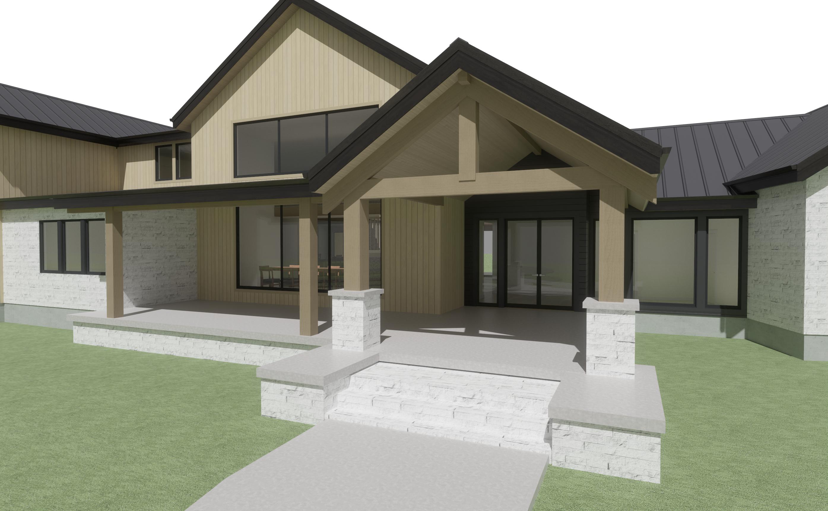 enhance the realism of the existing architectural design while maintaining the same materials and textures focus on realistic lighting shadows and surface details to create a lifelike appearance ensure the mixture of wood siding is preserved in the correct areas making them look authentic and cohesive this is in montana add montana landscape with nice landscaping near the house add montana vegetation around the house make wood siding modern vertical 10 wider plank siding natural cedar light warm honey tone clear matte finish clean sharp edges minimal knots contemporary scandinavian farmhouse style high end residential exterior the siding is not board and batten it is wide planks with realistic wood grain texture make the wood siding planks the same width as the image reference do not add a chimney add mountains far off in the distance do nice landscaping in front of house and and native montana vegetation in forground dont add chimney nice yard in foreground remember the wood siding should be clear with no knots rock siding should be white stacked keep black siding the same keep the angle of photo and perspective the same