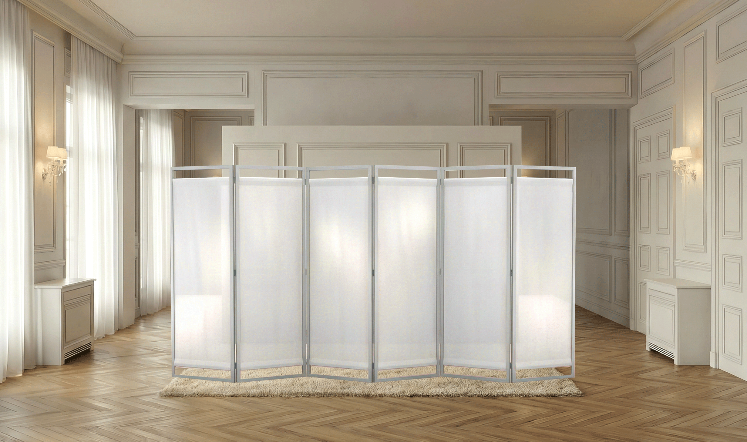 keep the entire background exactly unchanged do not modify the room walls floor lighting or composition only enhance the central folding screen to be ultra photorealistic aluminum frame thin brushed metal with subtle reflections slight imperfections precise edges fabric panels white slightly translucent textile soft tension minimal wrinkles light diffusion with gentle glow ensure realistic contact with the floor accurate shadows and natural integration with the existing lighting in the scene maintain the exact shape size and position of the screen no redesign photorealistic materials soft shadows physically accurate rendering