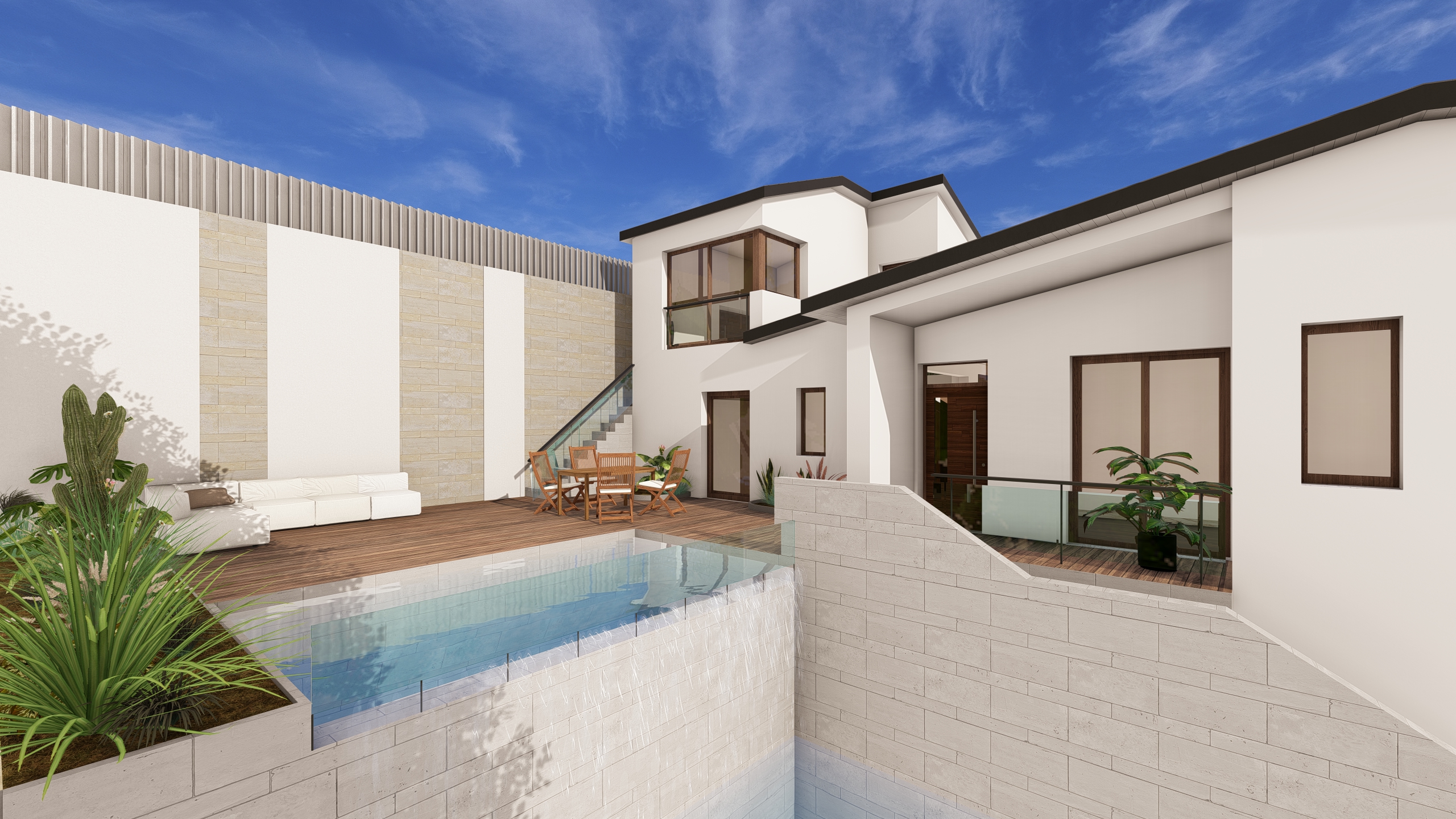 modernist exterior shot put one more color on the facade and keep some spots in white i want a different facade aesthetic but maintain the white architecture