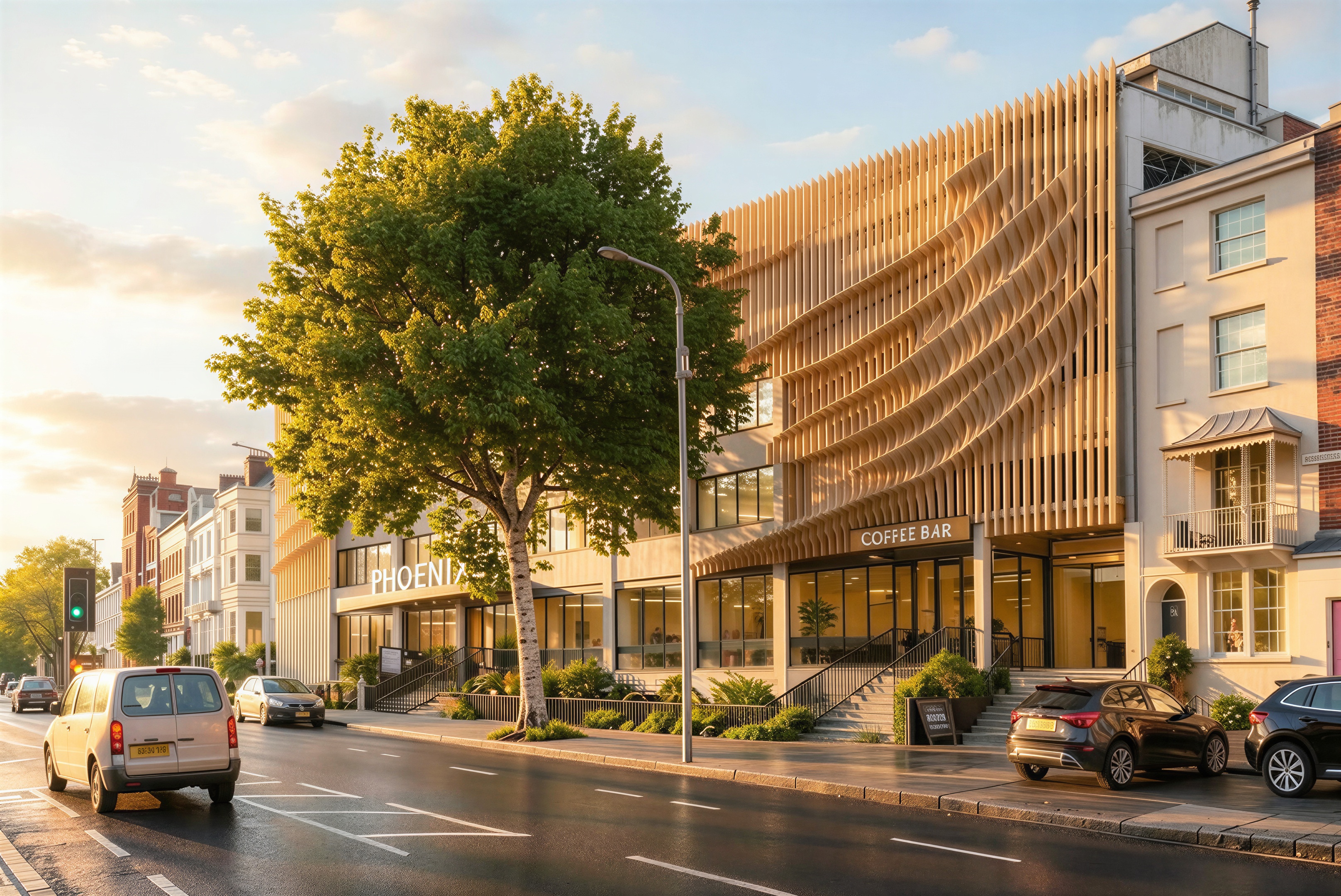 without changing anything else can you add 1 or 2 high quality blurred people walking in front of the building but not in the road