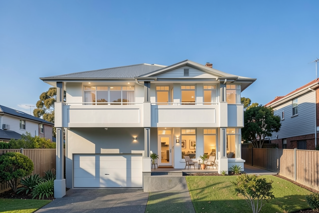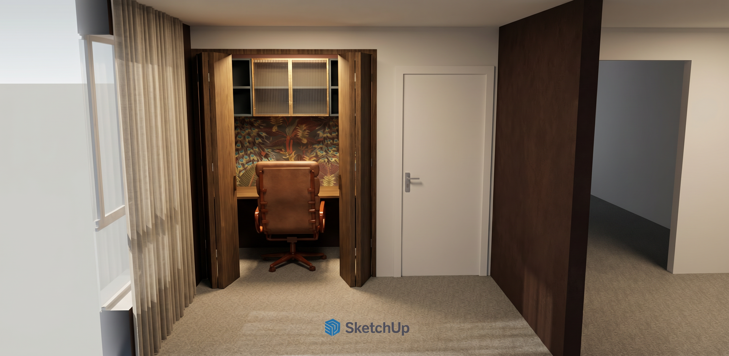 colours to remain accurate as per original given picture wood texture to be subtle niche internal and table surface in mid darker blue laminate moderately saturated with a grey undertone colour should appear deeper and richer but still muted not overly vibrant matte laminate texture vu finish with subtle surface grain non glossy top hung cabinet in solid colour light beige 2 casement door below window in solid colour light beige bed base in light beige microcement bed headboard in solid colour light beige ceiling in off white floor in muted light beige vinyl subtle grains ceiling fan in white 1 wall in medium neutral beige paint with a slight grey undertone muted and balanced colour should appear soft and earthy rather than yellow with a natural sand like tone smooth matte wall paint finish other walls in off white blinds in white wall skirting in white