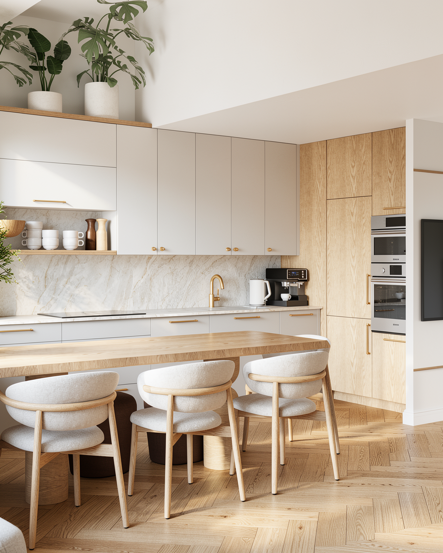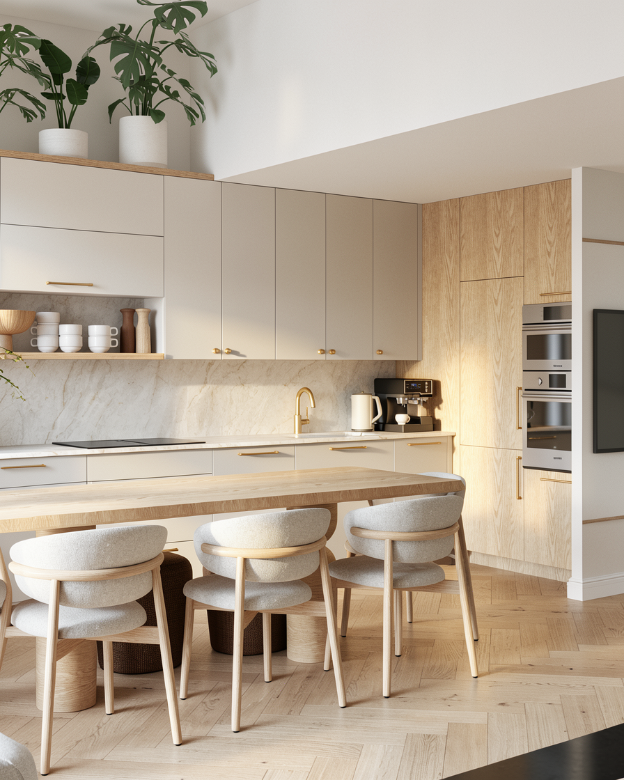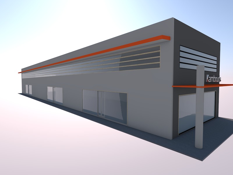modern architectural building sleek design with sharp angles rectangular shape smooth grey exterior large glass windows providing reflections horizontal metallic lines vibrant orange accents soft shadows clear blue sky background ambient daylight creating a calm and professional atmosphere
