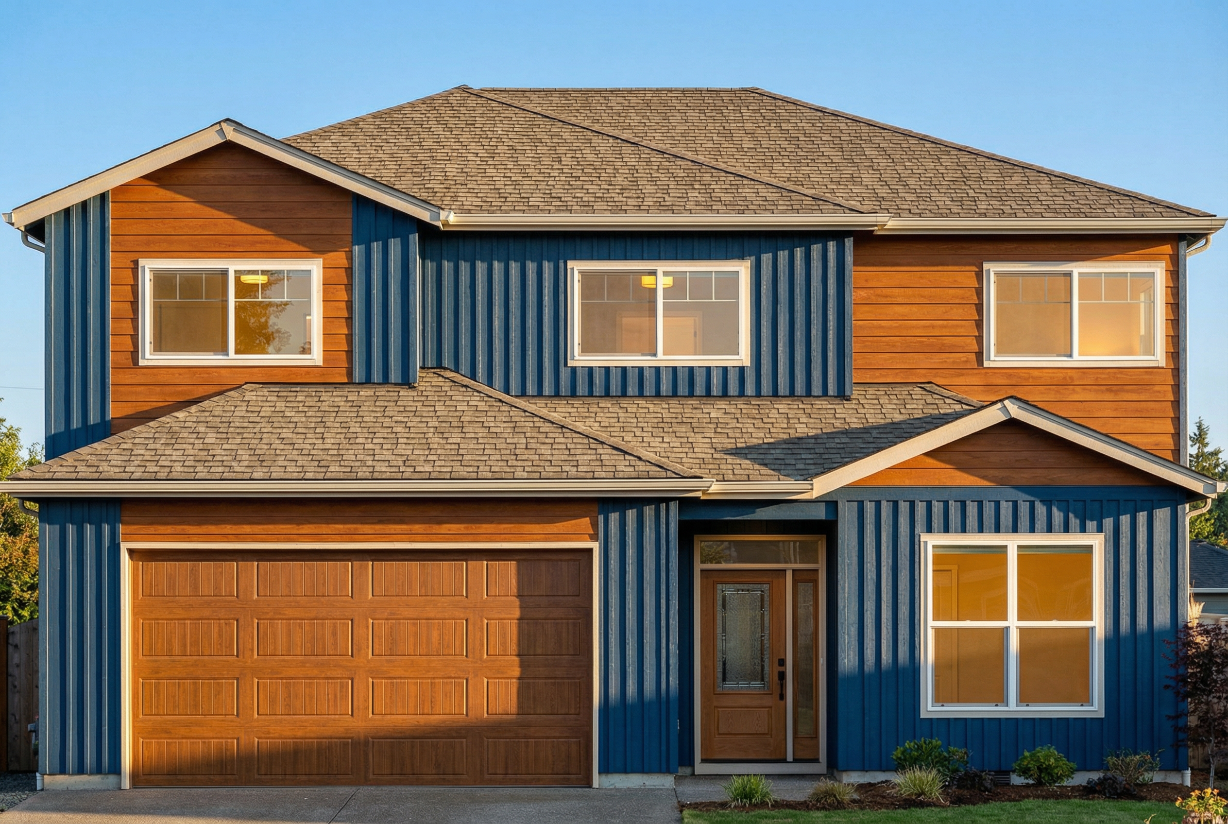 hardie s bay booth blue board and batten with wood tone horizontal siding the grey areas are the woodtone white garage door and front door