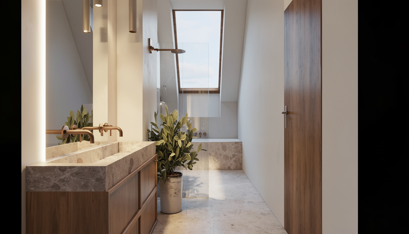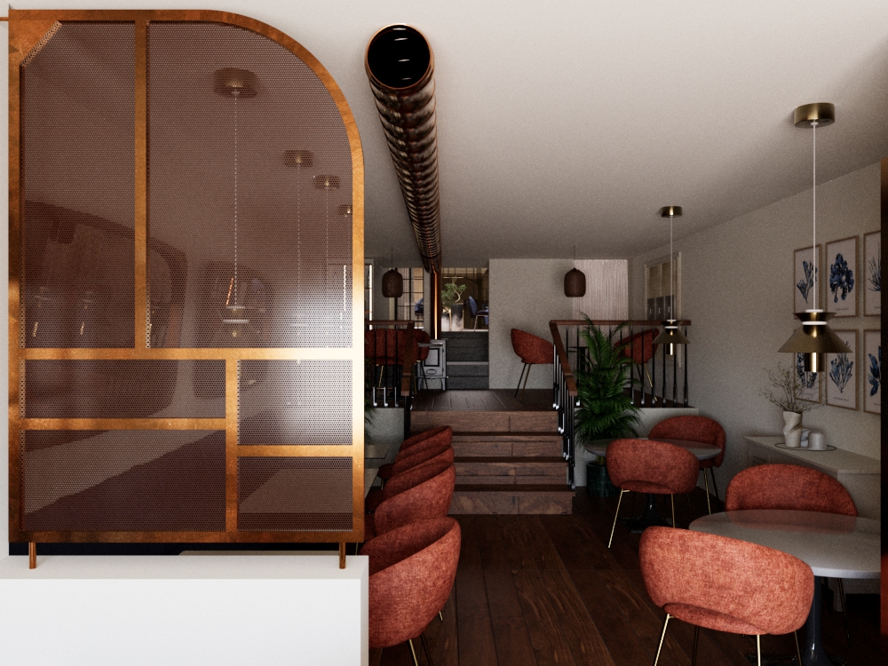 use the provided image as a fixed base maintain color mode preserve exactly the same geometry architecture camera position perspective proportions ceiling copper pipe stairs railings floor and furniture placement do not modify architecture layout or spatial configuration enhance the scene to create an ultra photorealistic luxury restaurant atmosphere all materials must appear high end refined and extremely realistic chairs must be upholstered in deep burnt terracotta velvet hyper realistic rich tactile velvet fabric with visible grain subtle sheen soft folds and natural light absorption not plastic or glossy the long bench seating must appear in deep navy velvet upholstery rich padded texture with subtle stitching and realistic fabric depth the pendant lamps must be the visual focal point of the scene creating a strong wow effect they must emit a very warm and welcoming light around 2700k with soft diffusion elegant glow and refined reflections the lighting must feel intimate atmospheric and luxurious enhancing the dining area and creating depth and contrast in the space use the provided image as a fixed base maintain color mode preserve exactly the same geometry architecture camera position perspective proportions ceiling copper pipe stairs railings floor and furniture placement do not modify architecture layout or spatial configuration enhance the scene to create an ultra photorealistic luxury restaurant atmosphere all materials must appear high end refined and extremely realistic chairs must be upholstered in deep burnt terracotta velvet hyper realistic rich tactile velvet fabric with visible grain subtle sheen soft folds and natural light absorption not plastic or glossy the long bench seating must appear in deep navy velvet upholstery rich padded texture with subtle stitching and realistic fabric depth the pendant lamps must be the visual focal point of the scene creating a strong wow effect they must emit a very warm and welcoming light around 2700k with soft diffusion elegant glow and refined reflections the lighting must feel intimate atmospheric and luxurious enhancing the dining area and creating depth and contrast in the space the mirrors on the wall must appear as dark vintage smoked mirrors with soft reflections and slightly aged tone the stair railing must enhance the black metal vertical bars with a refined matte black finish and elegant subtle reflections tables must include a minimal chic luxury table setting refined porcelain plates crystal glasses elegant metallic cutlery linen napkins and subtle candles naturally arranged enhance overall material realism deeper wood grain on the floor refined copper reflections on the ceiling pipe and subtle natural material imperfections the environment must also be illuminated by soft diffused natural daylight coming from outside gently filling the space and enhancing materials and textures while maintaining the warm and intimate atmosphere of the restaurant lighting must feel cinematic warm and intimate with soft shadows and refined contrast ultra photorealistic elegant contemporary fine dining mood the stair railing must enhance the black metal vertical bars with a refined matte black finish and elegant subtle reflections tables must include a minimal chic luxury table setting refined porcelain plates crystal glasses elegant metallic cutlery linen napkins and subtle candles naturally arranged enhance overall material realism deeper wood grain on the floor refined copper reflections on the ceiling pipe and subtle natural material imperfections lighting must feel cinematic warm and intimate with soft shadows and refined contrast use the provided image as a fixed base maintain color mode preserve exactly the same geometry architecture camera position perspective proportions ceiling copper pipe walls floor and furniture placement do not modify architecture layout or spatial configuration enhance the scene to create an ultra photorealistic luxury restaurant atmosphere all materials must appear high end refined and extremely realistic chairs must be upholstered in deep burnt terracotta velvet hyper realistic rich tactile velvet fabric with visible grain subtle sheen soft folds and natural light absorption not plastic or glossy the pendant lamps must be the main visual focal point of the image creating a strong elegant wow effect they must emit a very warm and welcoming light around 2700k with soft diffusion and refined glow the space must also be well illuminated by soft natural daylight coming from outside creating a balanced lighting environment natural light must gently fill the room enhancing material textures and adding depth while maintaining a warm and intimate restaurant atmosphere the large artwork on the wall must appear refined and elegant with soft integrated backlighting creating a subtle halo glow that enhances the painting the wine shelf on the right must contain premium wine bottles arranged elegantly with realistic glass reflections tables must include a minimal chic luxury table setting refined porcelain plates crystal glasses elegant metallic cutlery linen napkins and subtle candles naturally arranged enhance overall material realism deeper wood grain on the floor refined copper reflections on the ceiling pipe and subtle natural material imperfections lighting must feel balanced between natural daylight and warm interior lighting creating soft shadows depth and refined contrast typical of a luxury fine dining restaurant ultra photorealistic elegant contemporary fine dining mood