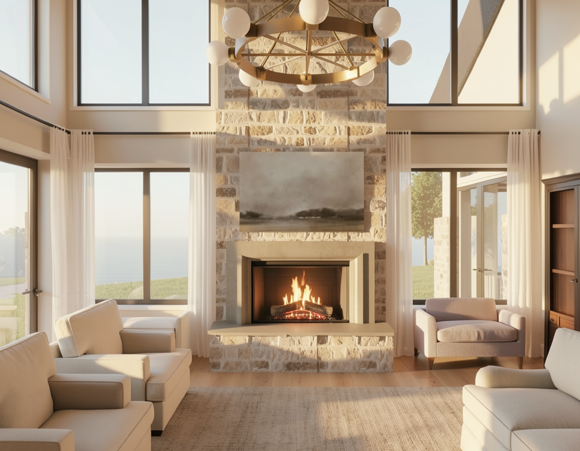 black frame picture windows off white stucco siding on first level hardie siding on second level 4k render