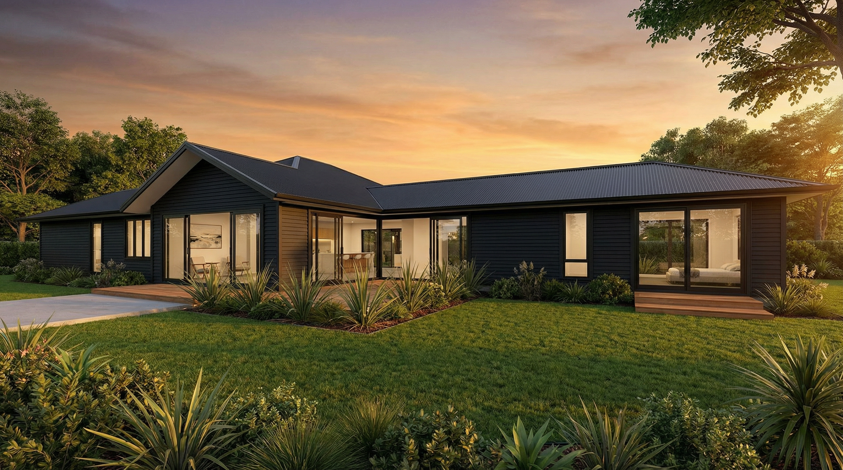 make me a realistic picture of a modern house in guyana with earthy vibe of facade