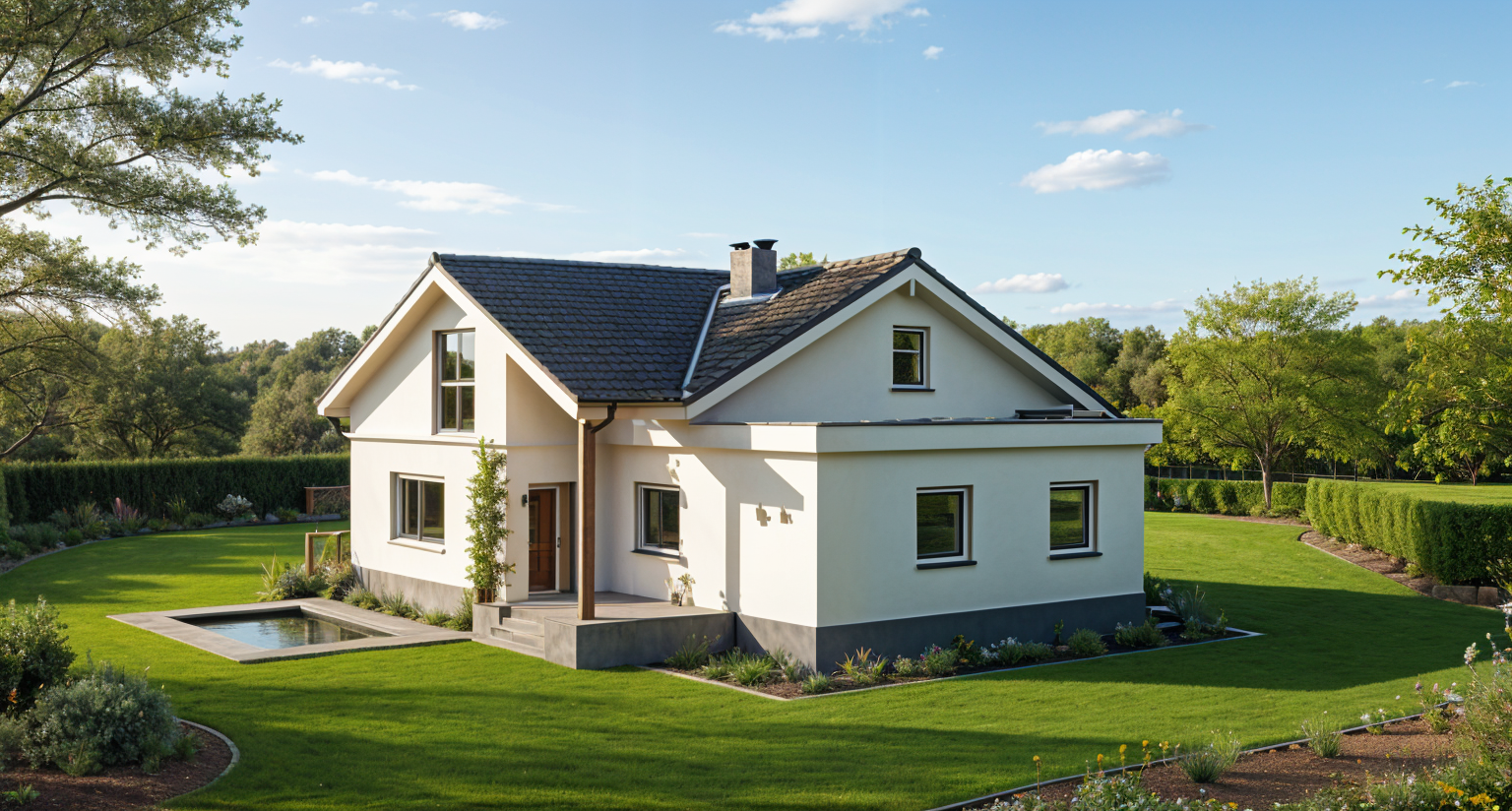 black metal fenc in front of the house brown carport on the left side flowers in the garden