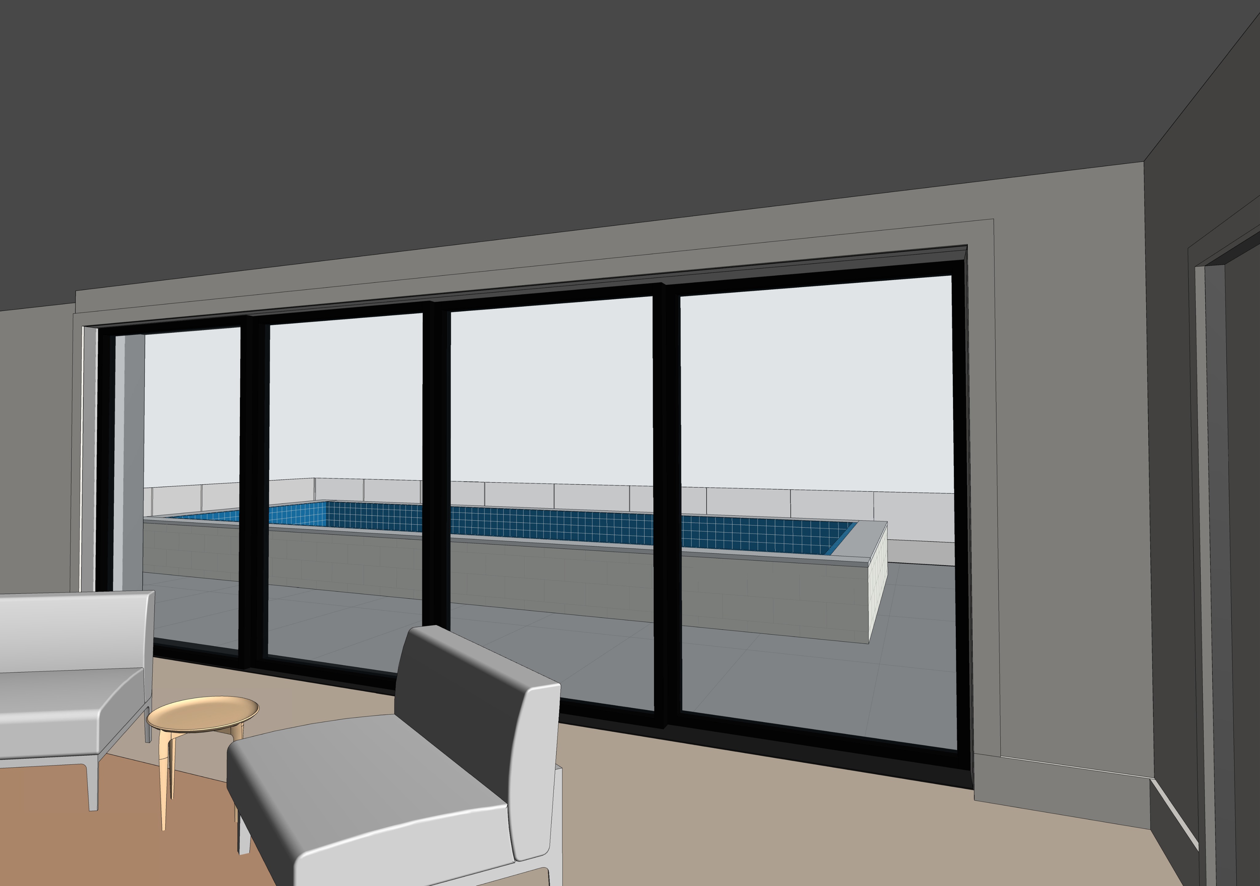 add water in pool sunny day brown leather chairs light oak flooring inside light tan tile around pool walls and tile on floor outside blue tile inside pool add colorful rug under chairs and table inside