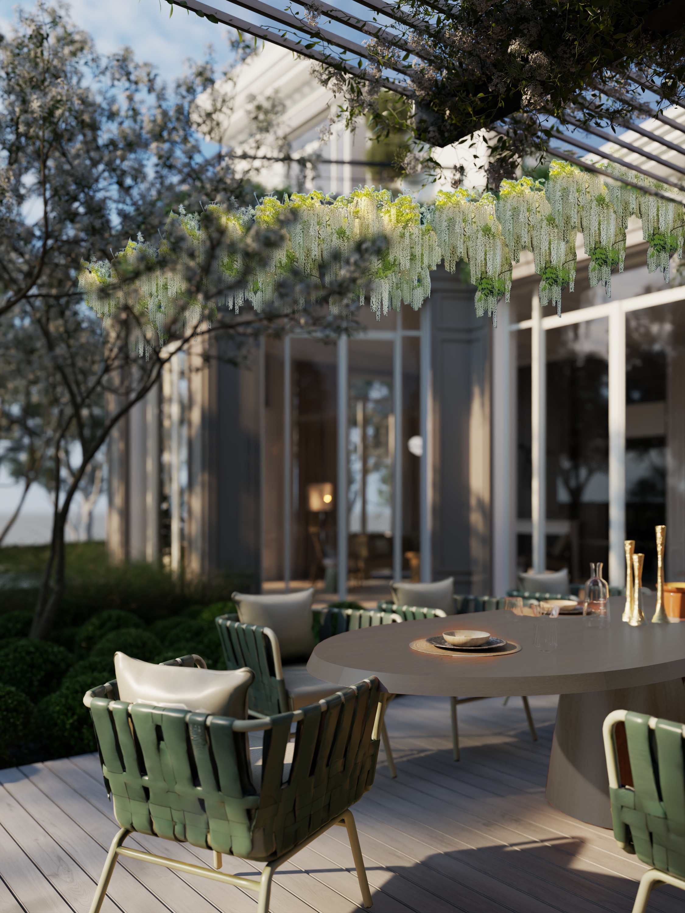 enhance the realistic texture and morning lighting maintain the elements material and angle of the picture make the wisteria plants behind the trees