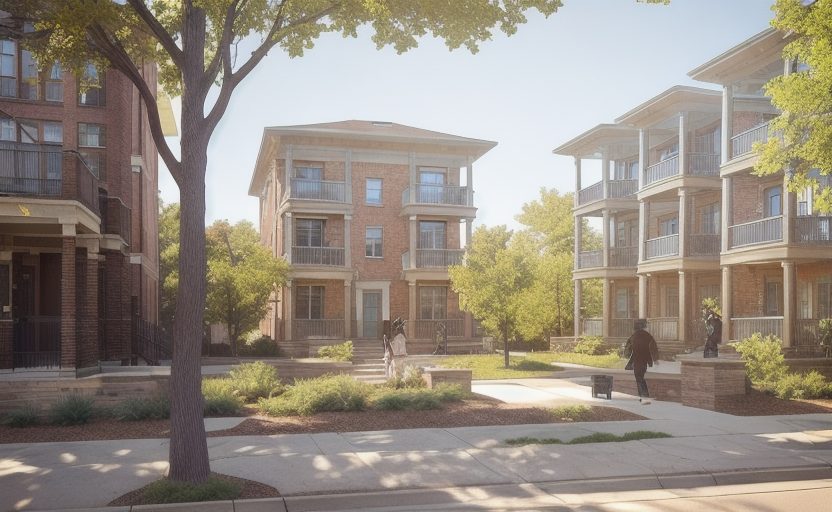 sustainable design exterior shot modern renovated historic kansas city apartments central green court with clear pedestrian hierchy active porch and entry relationship to the court landscape integration that softens the building visual separation barrier from the road heavy masonry expression reduced glazing where appropriate setbacks and landscape buffers strong vertical rhythm to reinforce urban presence masonry colonnades cornice lines architecture